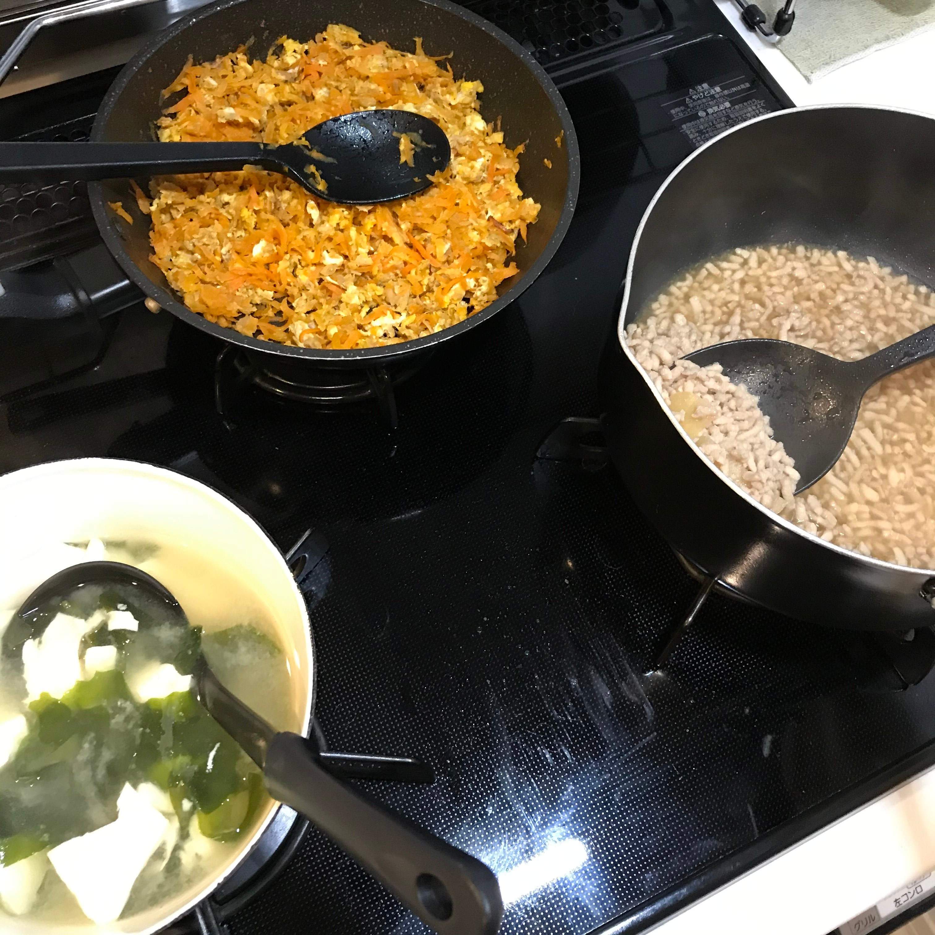 ▼3口コンロで味噌汁も同時につくれなくもないですね。そうすうると15分でも調理可能かもしれません。