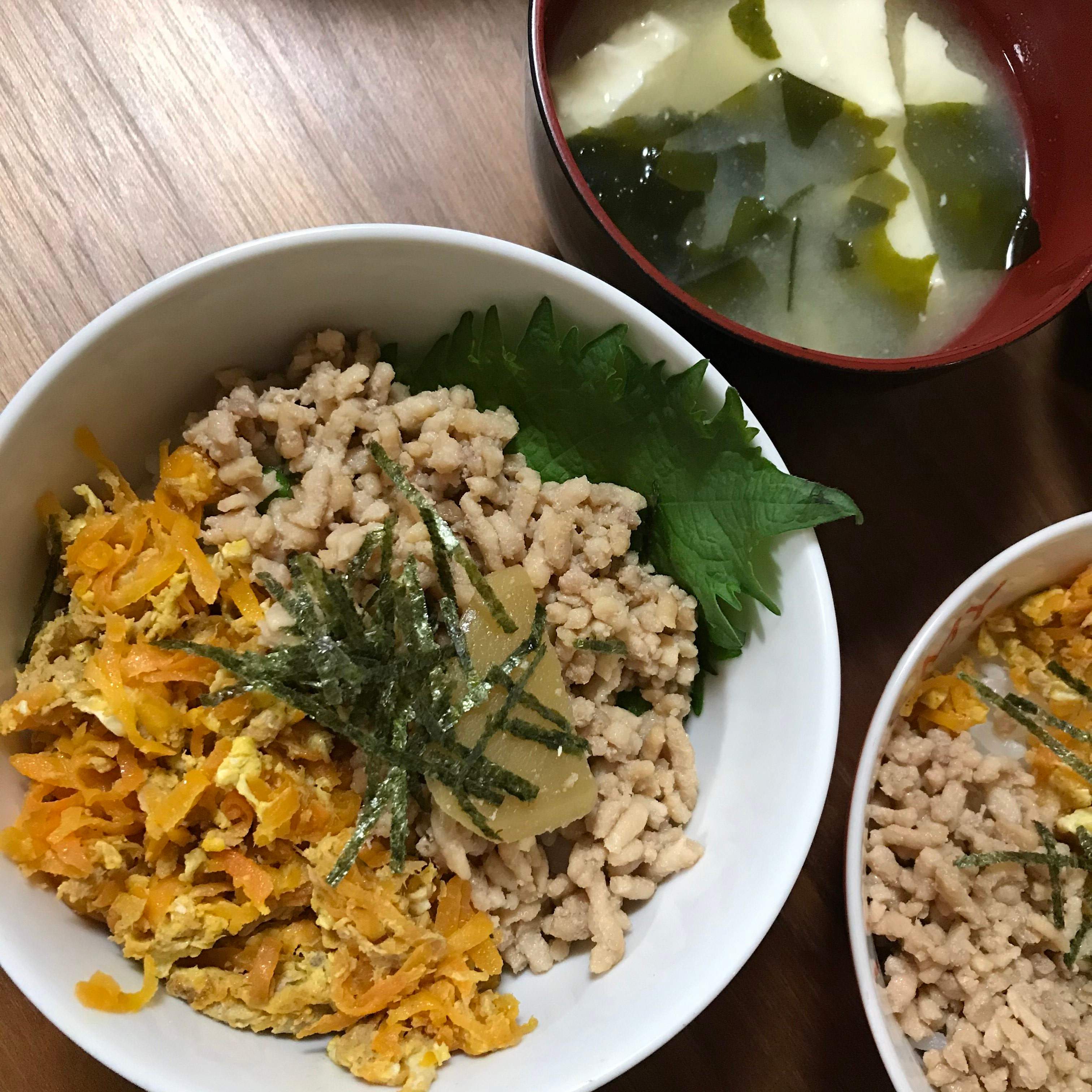 鶏そぼろと人参しりしりをどんぶりに。汁物はごろごろ豆腐のお味噌汁です。この日は昨日の残りの酢の物などがあったのでいっしょに食べましたが、外食したい気分のなか重い腰を上げてこれだけつくったのです。じゅうぶん合格じゃない?と思います!!(自画自賛)