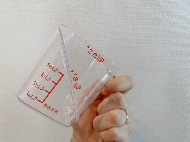 毎日のことだからこそ実働時間を少しでも減らしたいというあなたにオススメなのが、ダイソーで見つけたイノマタ化学の「ライスカップ2合」。その名の通り2合分を一気に計量できるアイテムです。