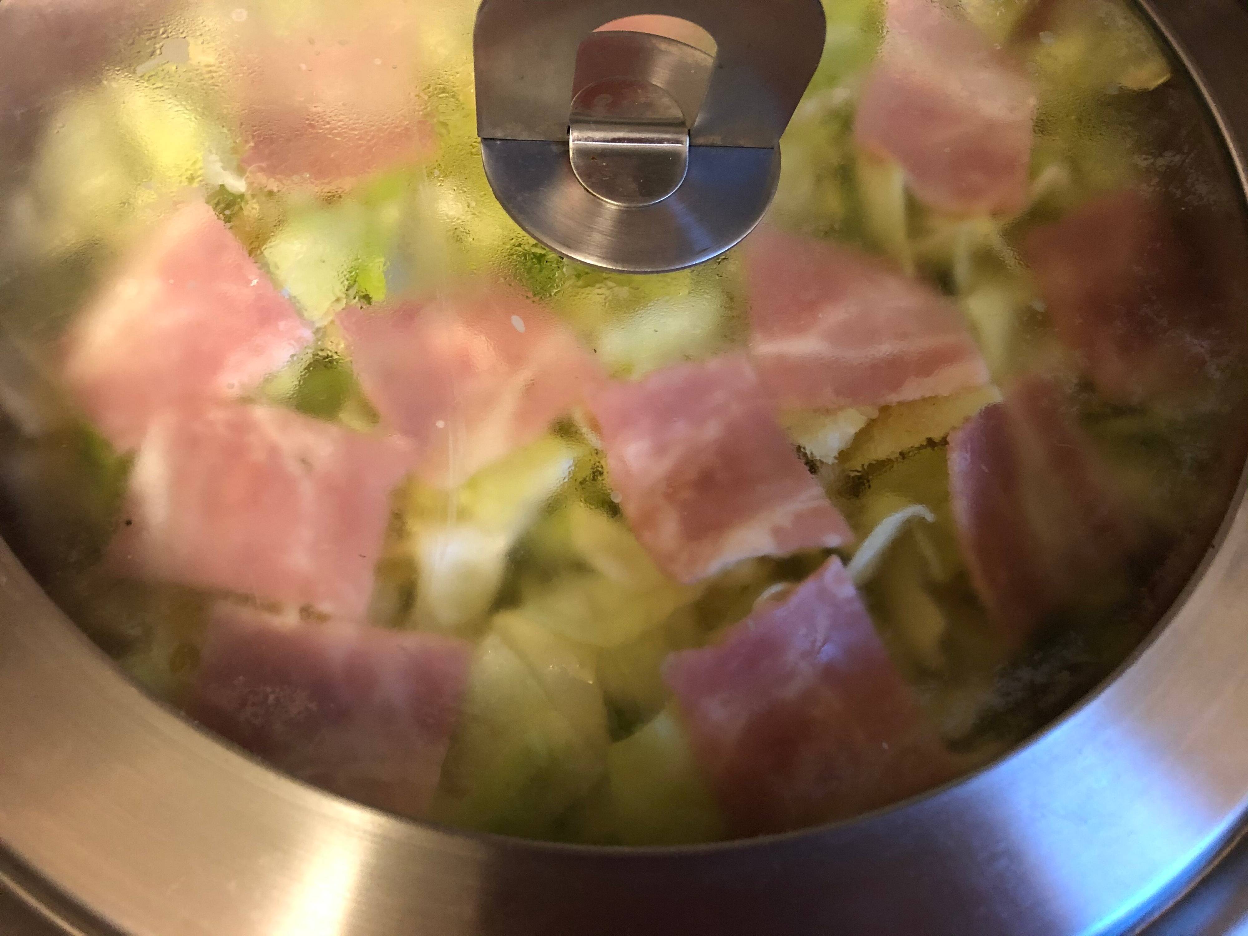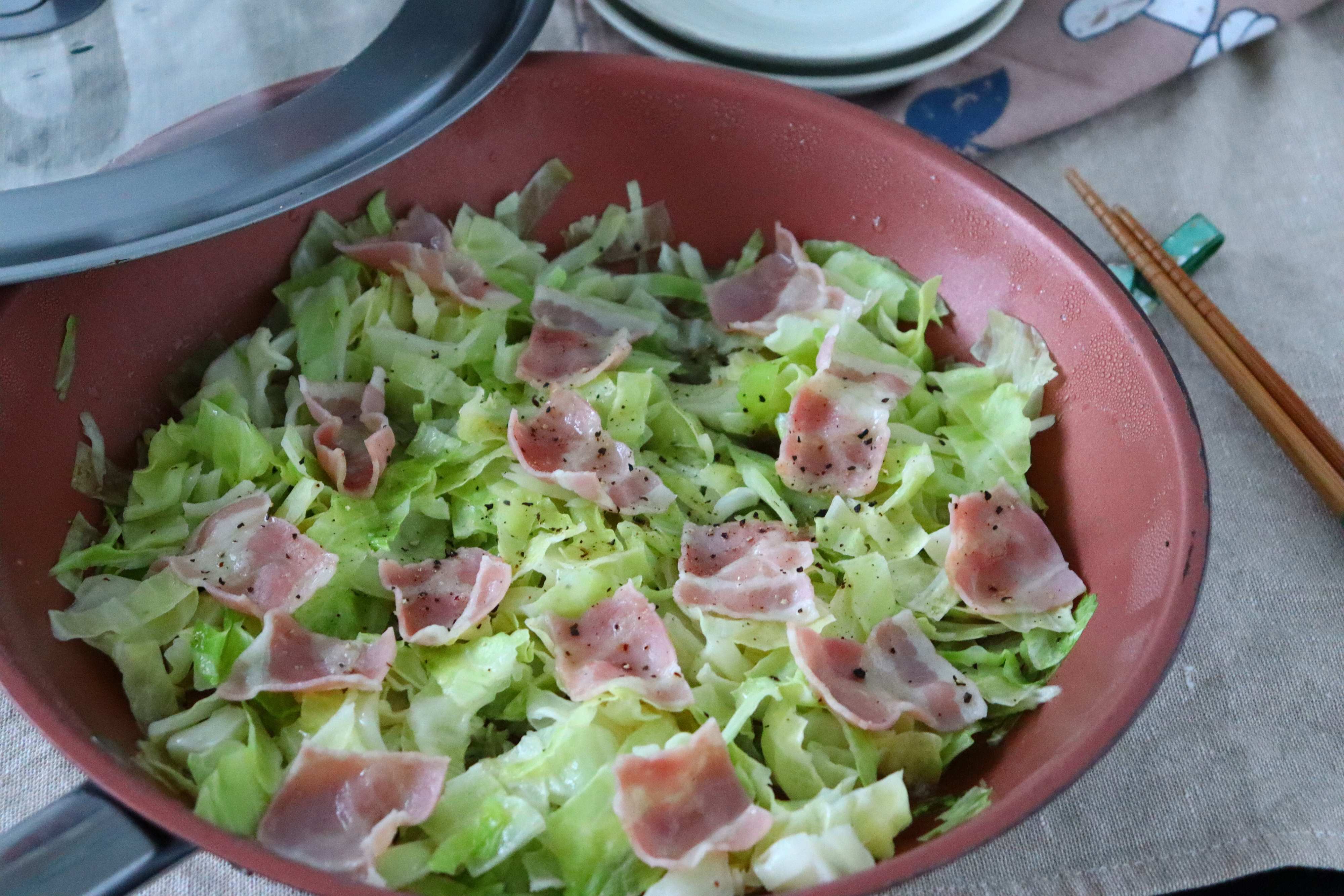 ベーコンに火が通って、キャベツも鮮やかなグリーンになったら、食べごろです。