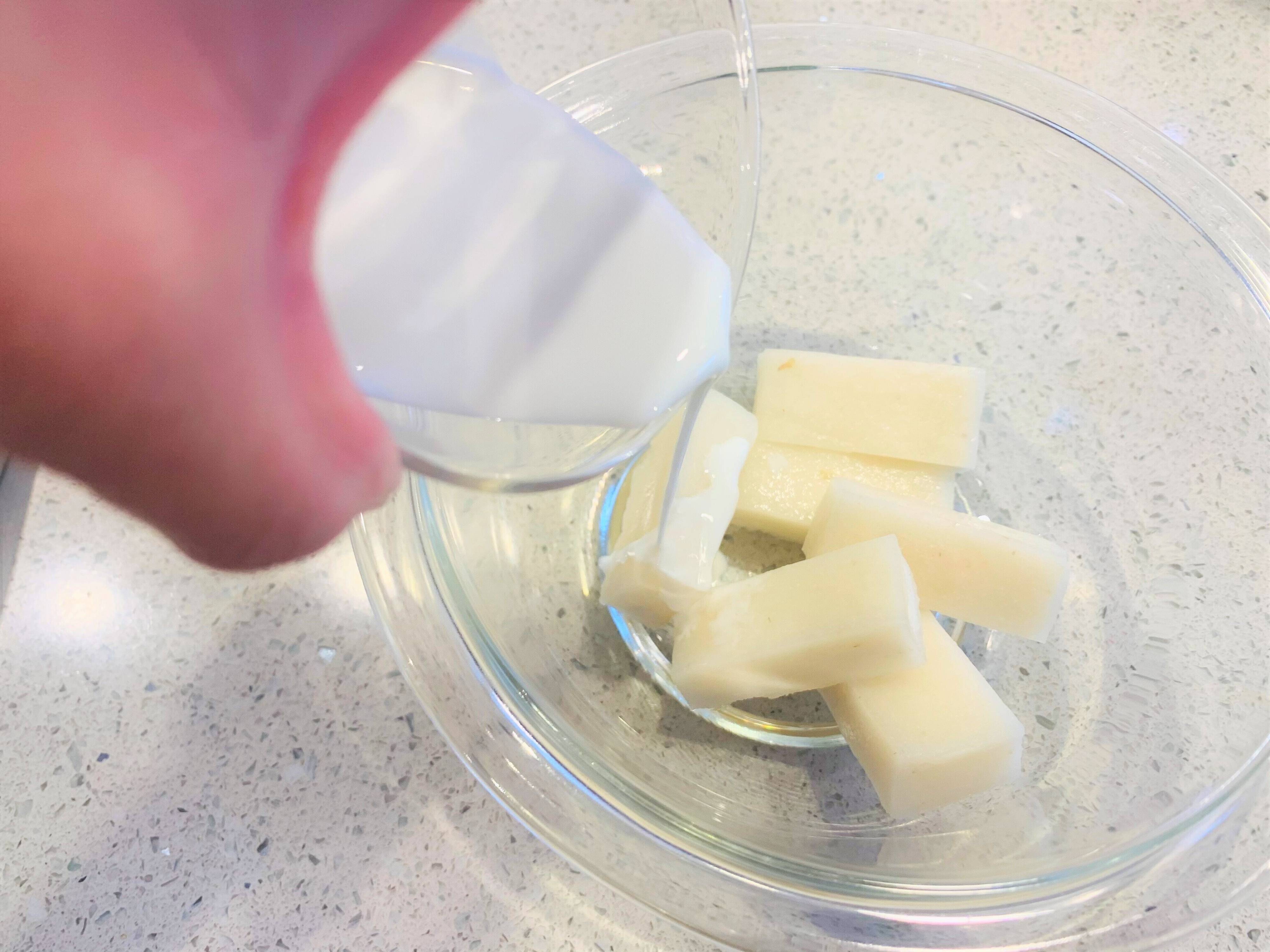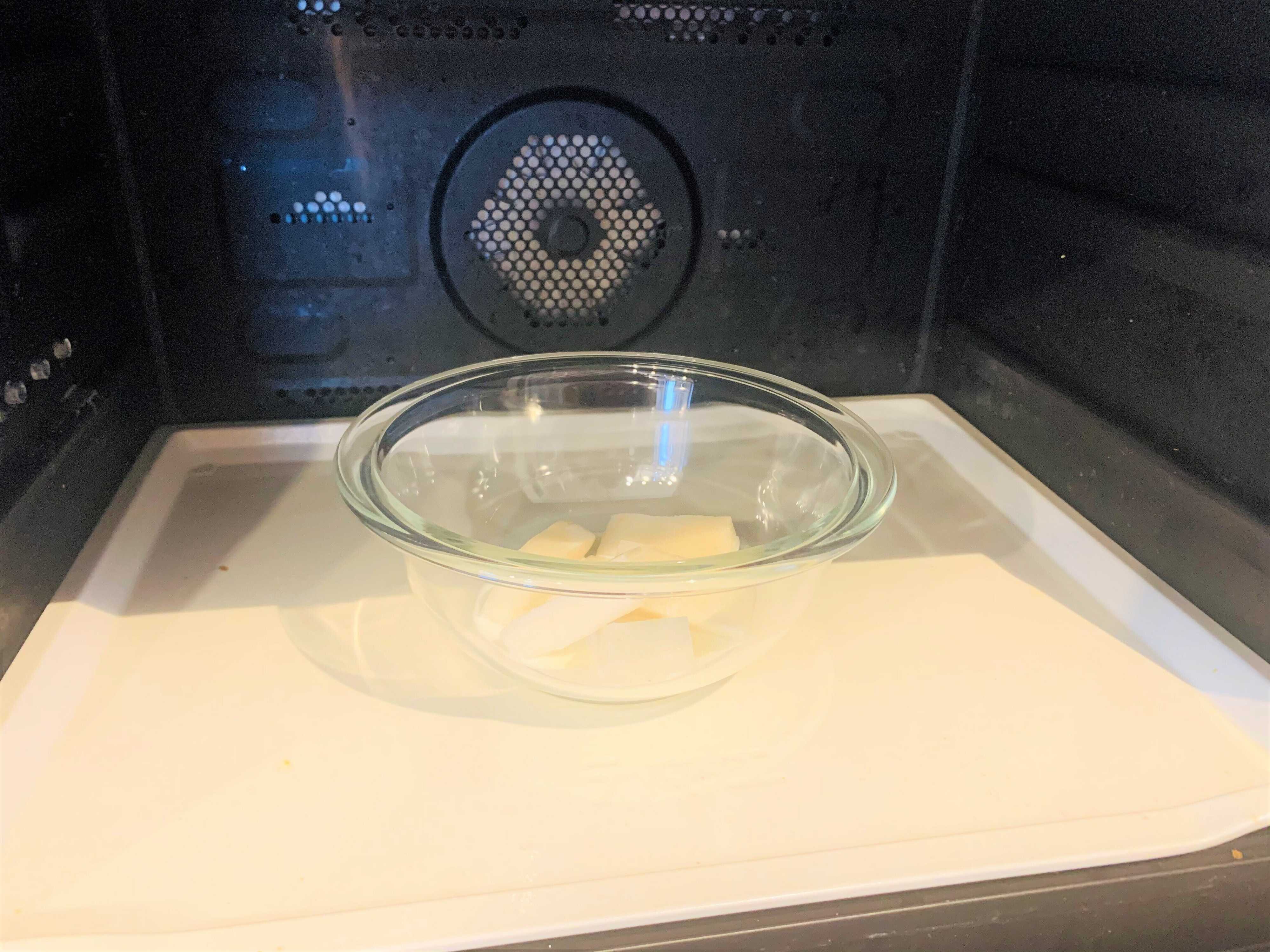 1.耐熱ボウルに3つに切ったお餅と牛乳を入れます。