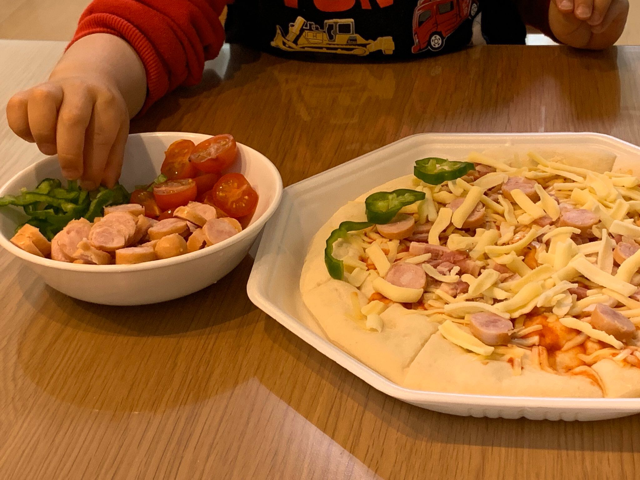 子どもたちに市販ピザにトッピングしてもらいます。市販ピザそのものだけだと、野菜がたりない気がしますが、冷凍しておいたピーマンやキノコを解凍してのせてもらうと、途端に豪華に。