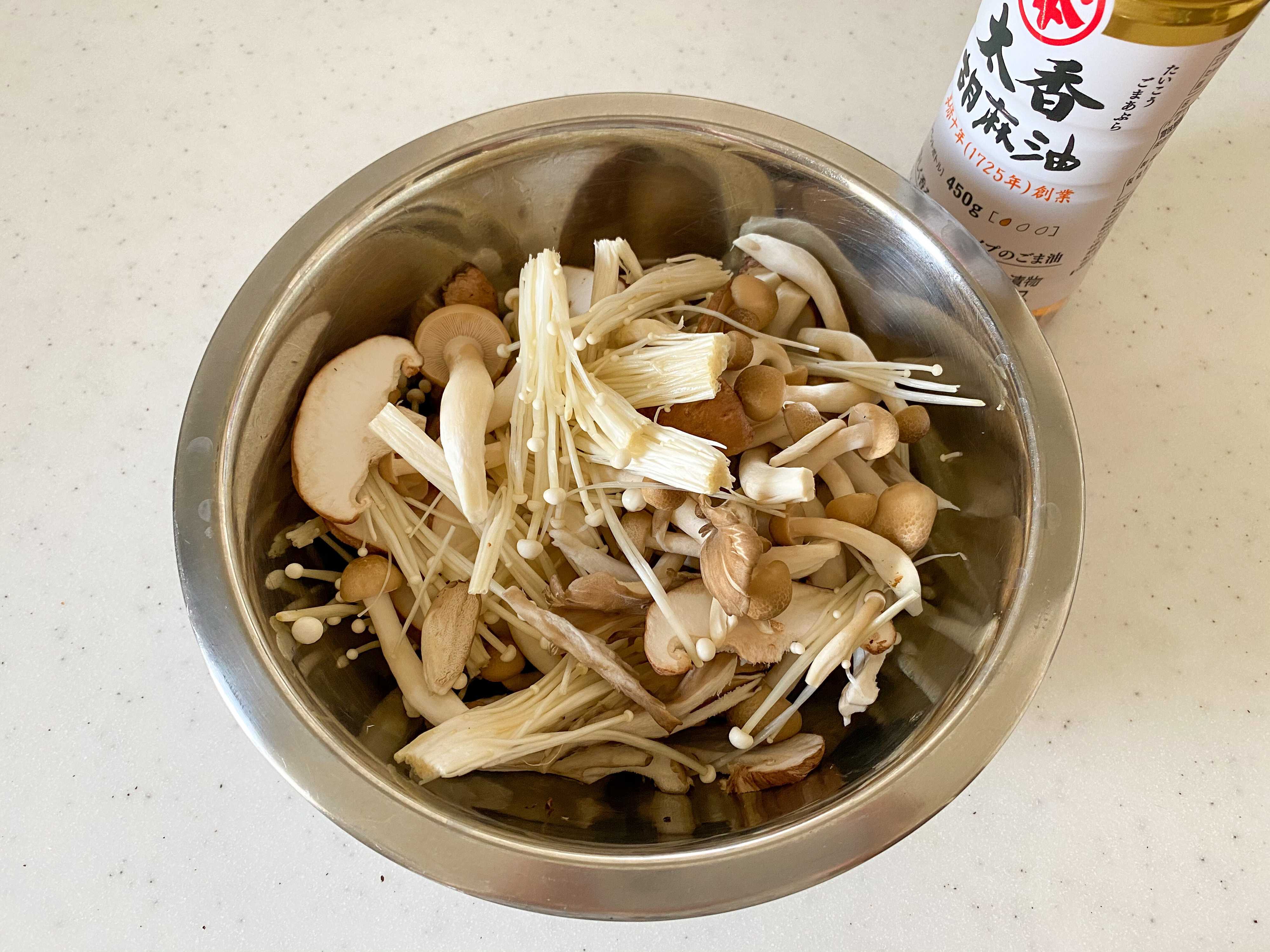 椎茸は薄切りに、舞茸・しめじ・えのきだけは小房に分けてボウルにいれ、ごま油を大さじ1程度まわしかけ、よく和える。