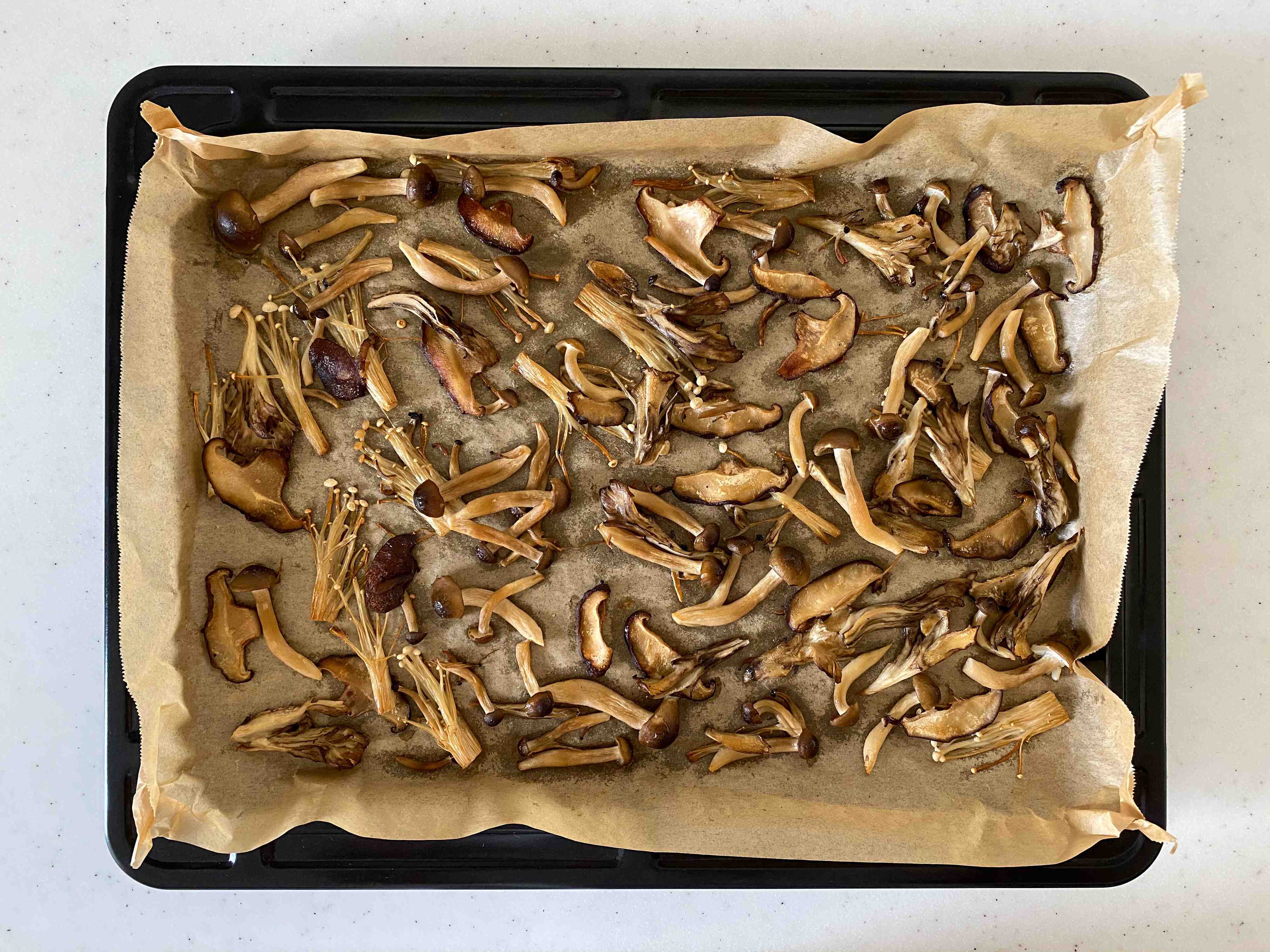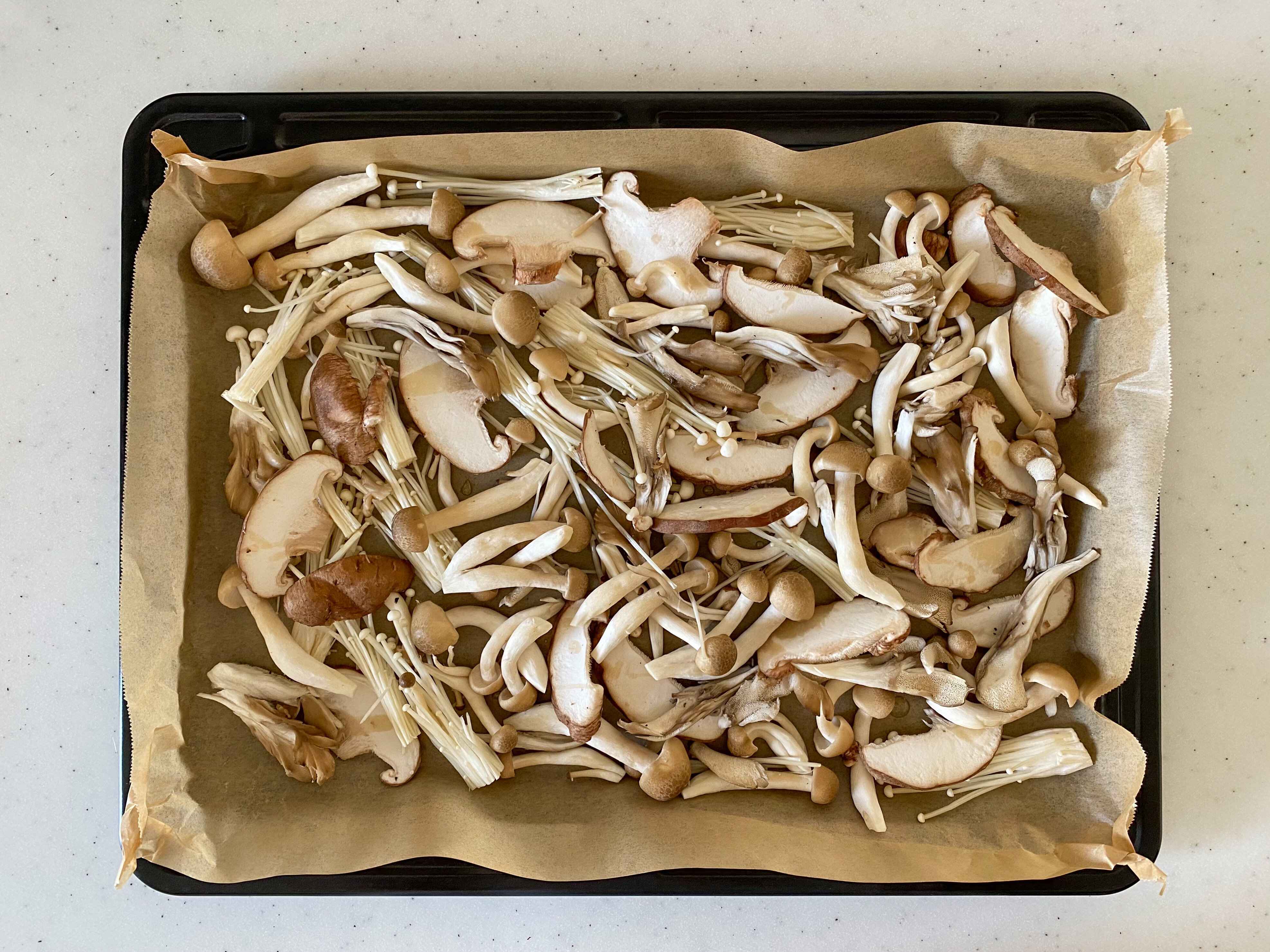 天板にオーブンシートを敷き、きのこをできるだけ広げていれる。