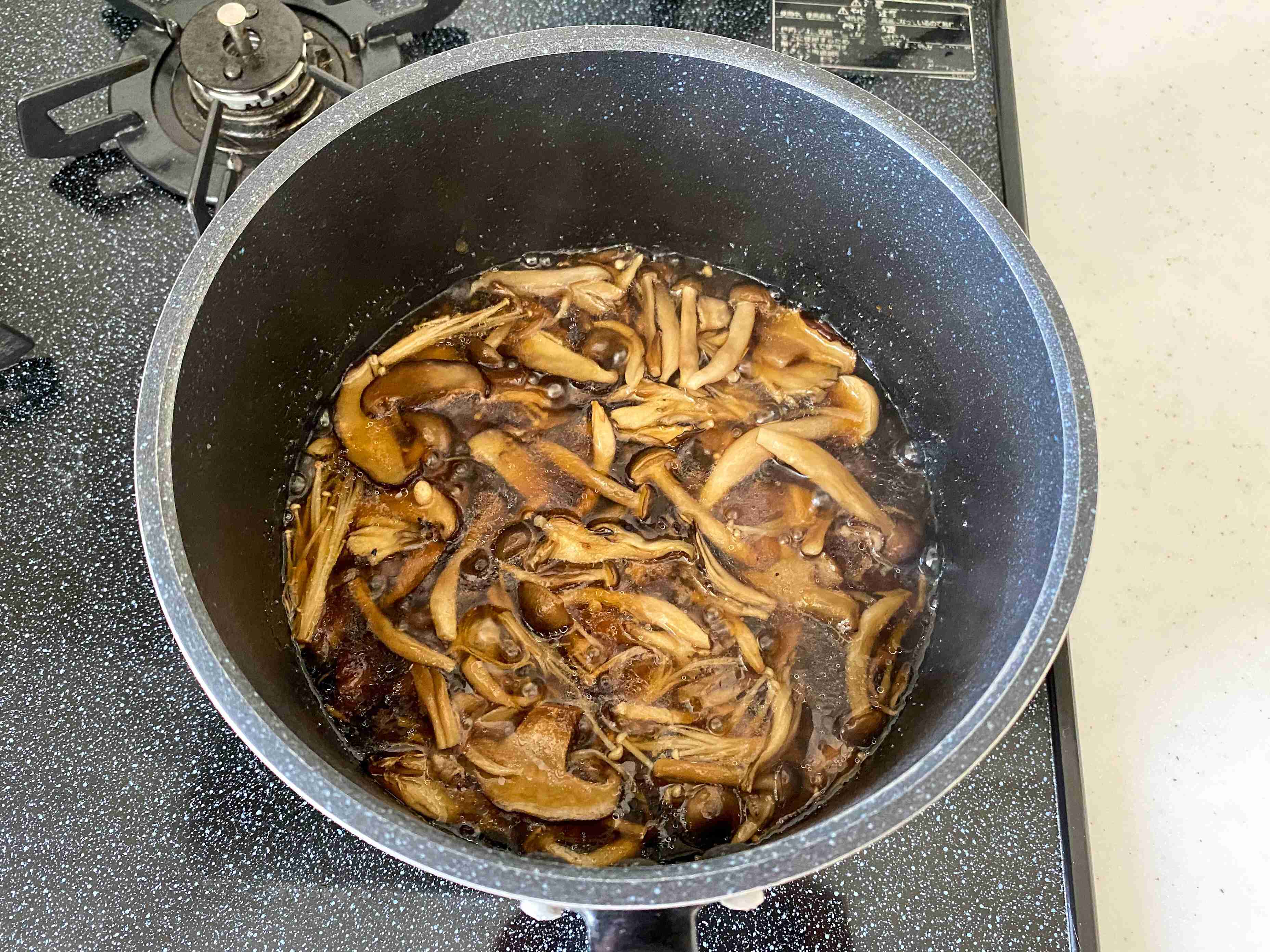 焼ききのこを加えて1分煮た後、同量の水で溶いた片栗粉を加えてとろみをつけて火を止める。