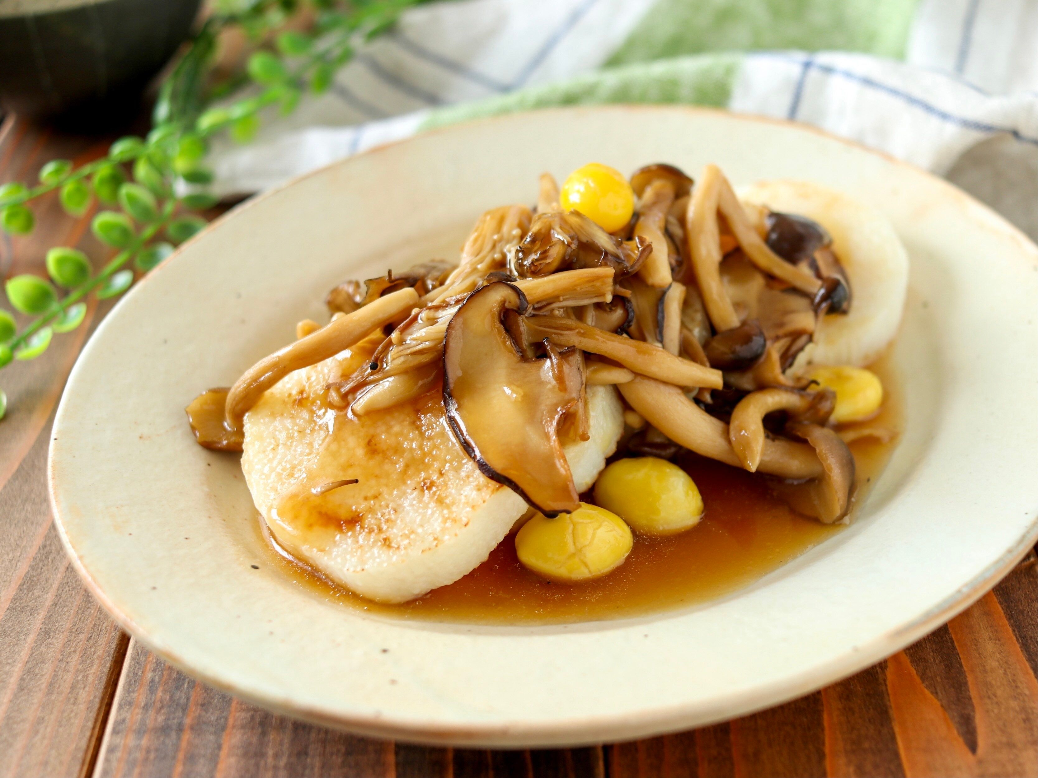 焼ききのこのあんかけに銀杏を加え、豆腐の代わりに長芋をさっと焼いたものにするだけで、一気に「秋」を感じる一品に。