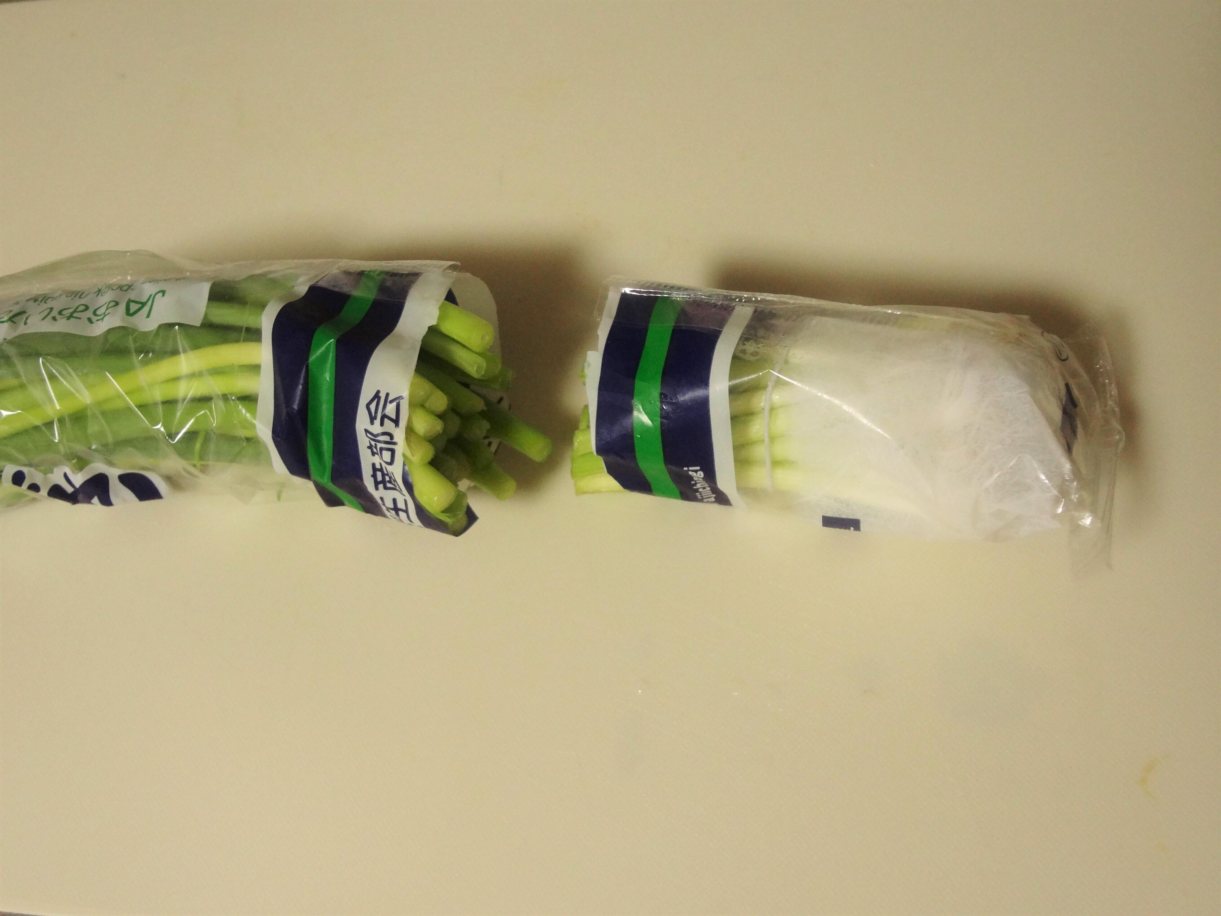まずは根元から5cm位を袋ごと切ります。袋からとりだしてさっと洗い、キッチンペーパーで水気を拭き取ります。