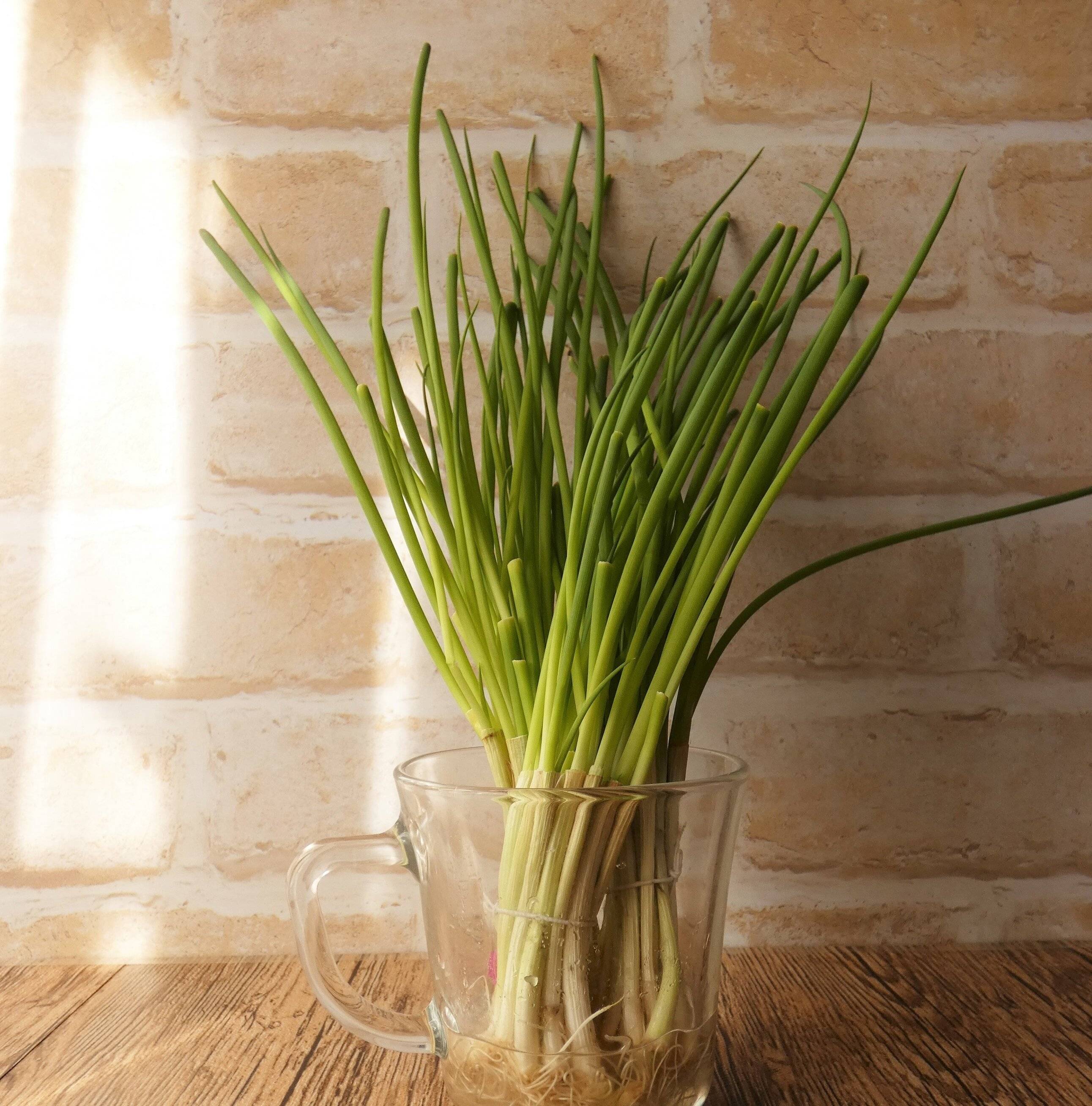 根元部分を長く残して切ったのは、再生野菜を栽培するため。容器に入れて窓際に置いておくとどんどんのびて、また収獲できるんです。