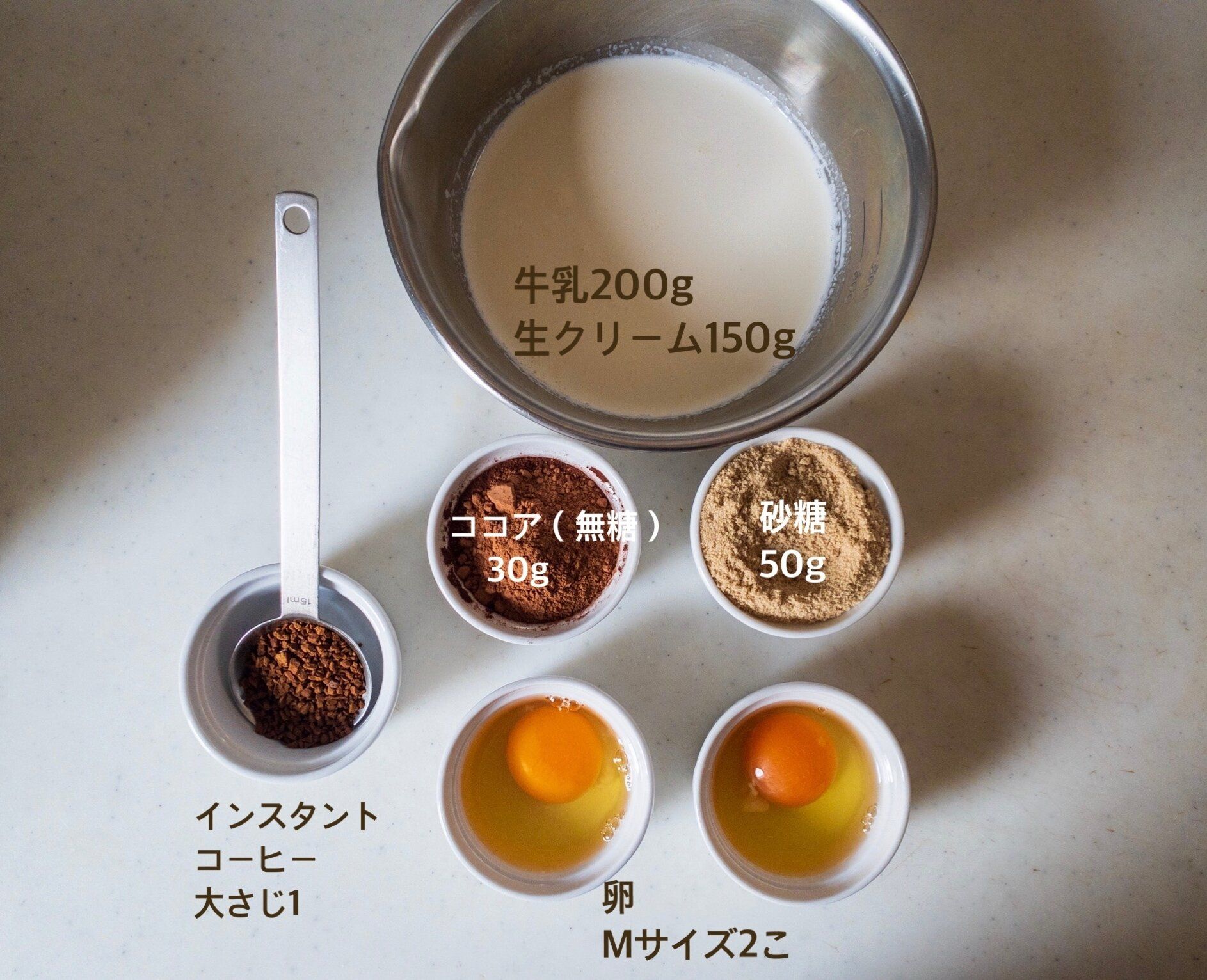 今回はショコラプリンなので、ココアと濃厚にするため生クリームを使用、隠し味にインスタントコーヒーをいれてちょっと苦味をたして大人なショコラプリンにしあげます。