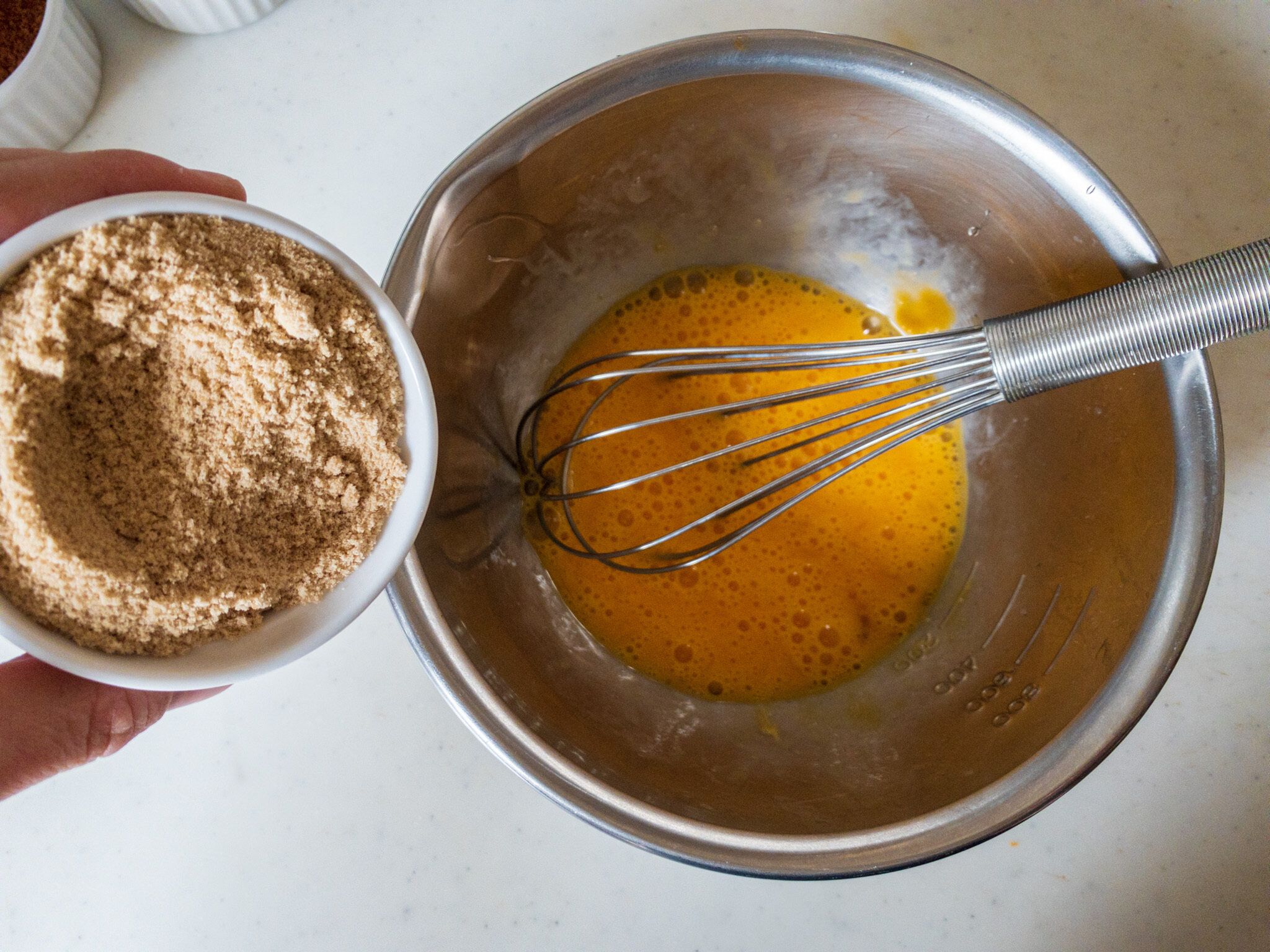 1.ボールに卵をほぐし、砂糖を加えてホイッパーで混ぜます。