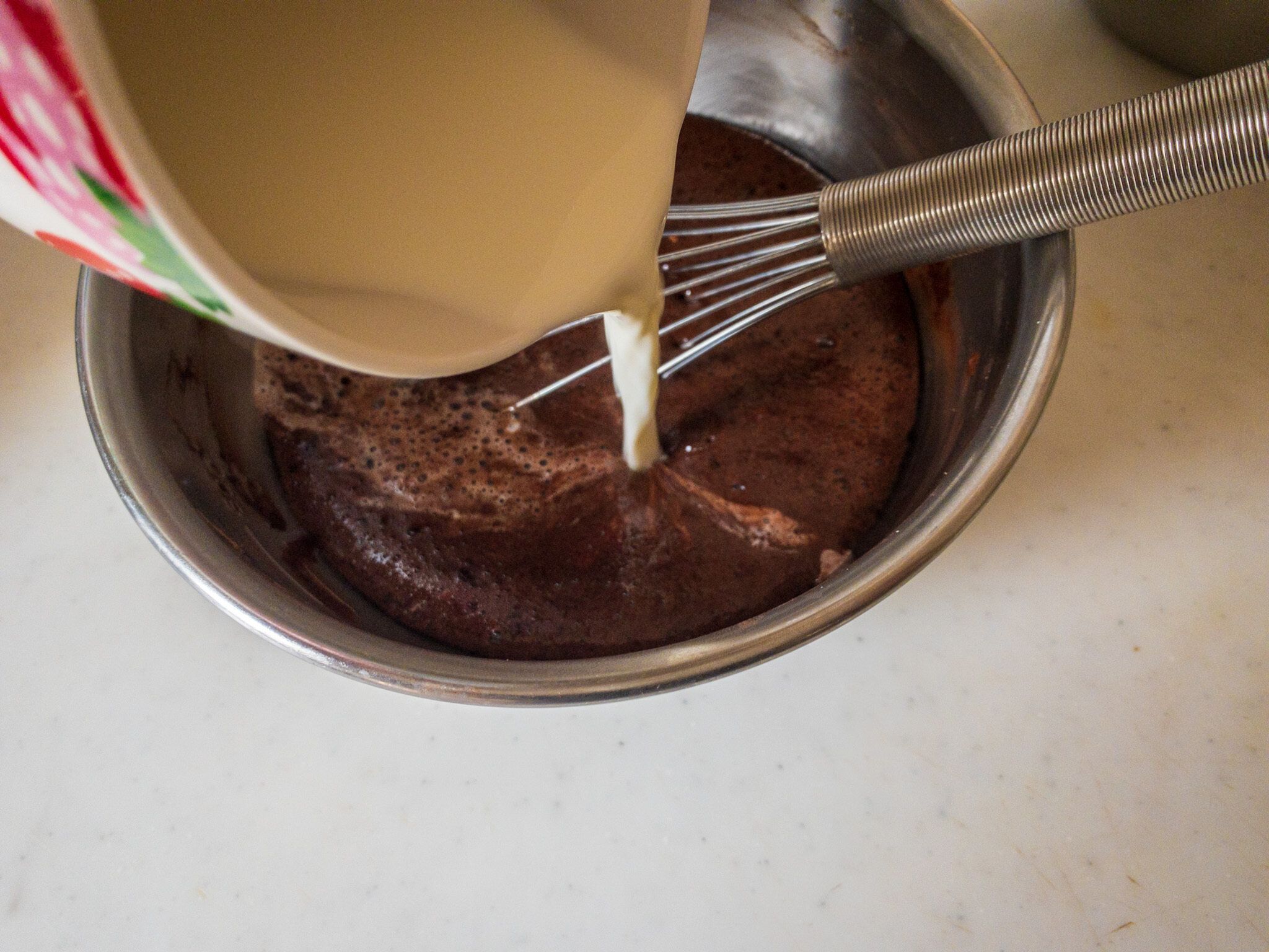 3.温めた牛乳と生クリームを入れて全体をよく混ぜます。