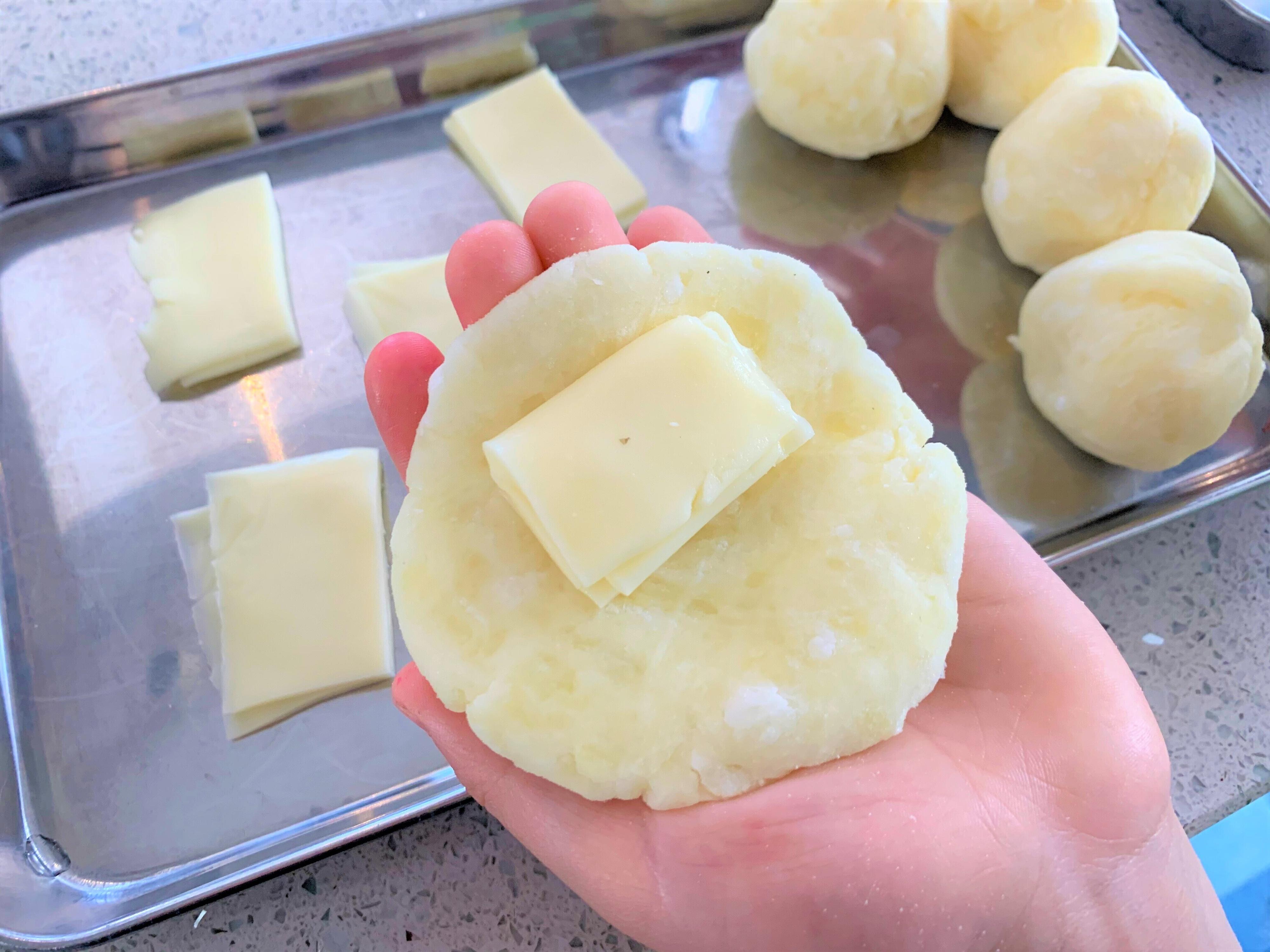 2.6つに分けて、中にチーズを入れて平らに成形します。(形は薄く平らにすると短時間で焼きやすいです。)