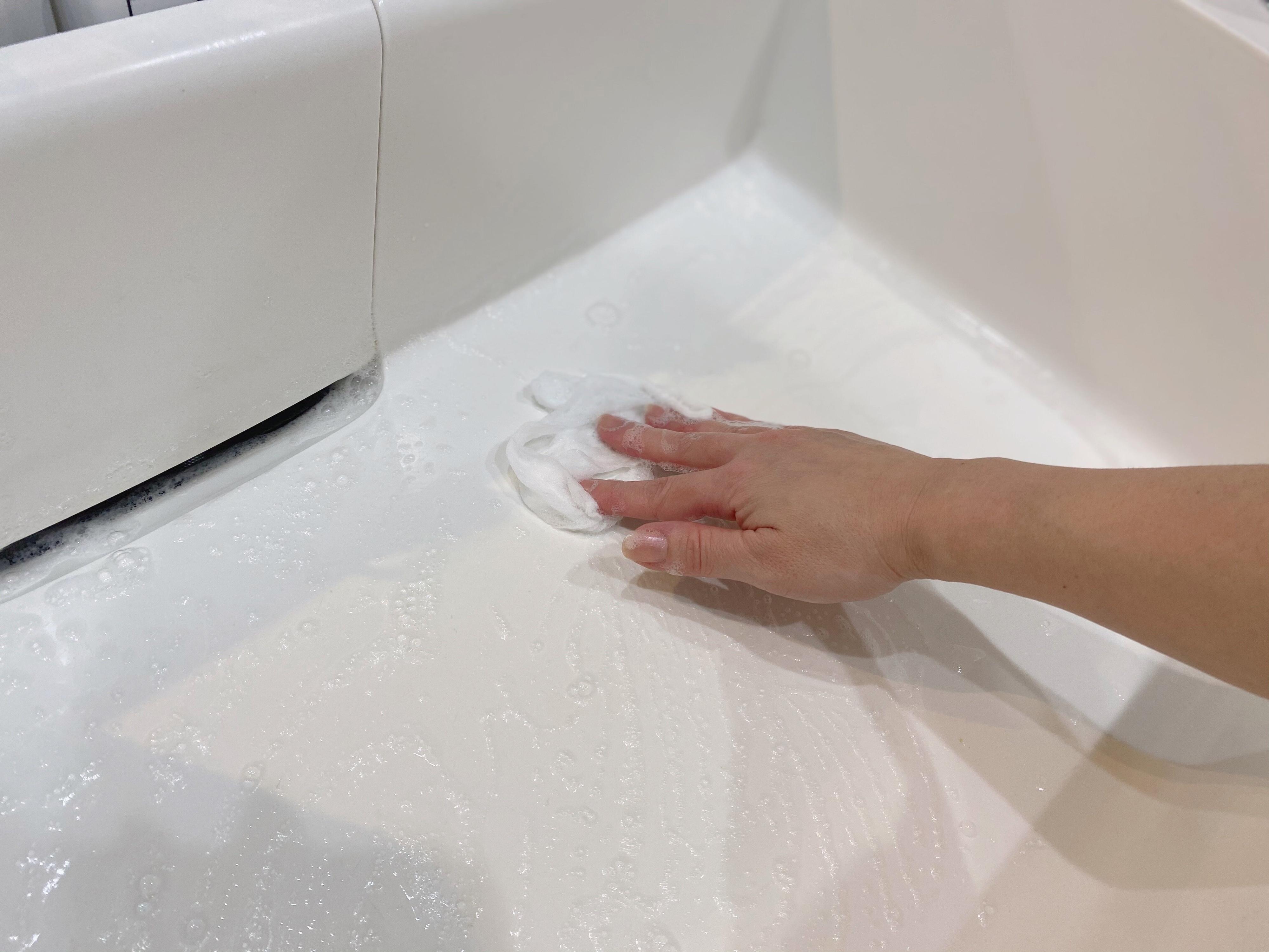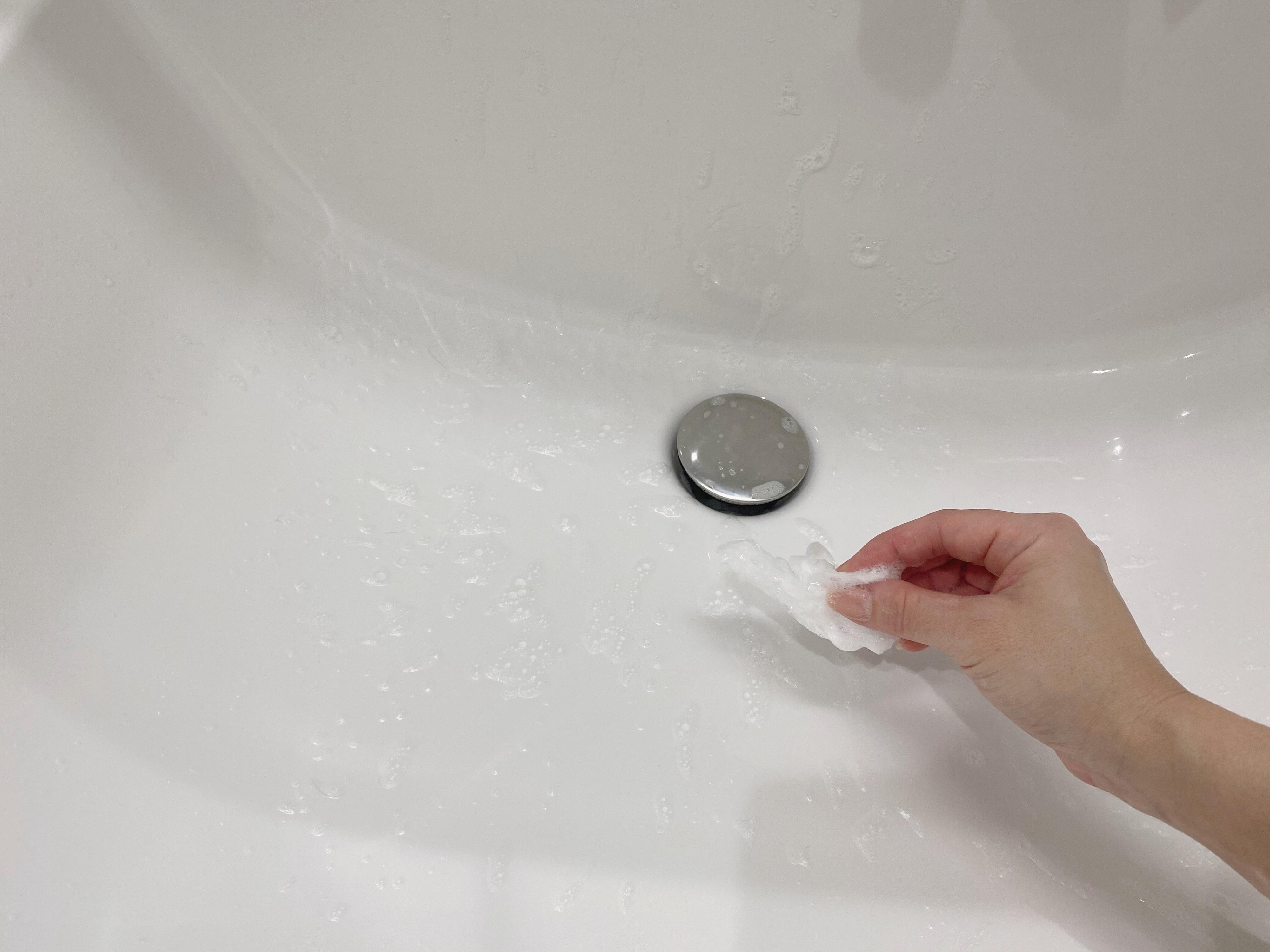 キッチンのシンク、洗面台ボウル、トイレの手洗い器など、使える箇所はたくさんあります。例えば洗面台のボウルでは、ラップにハンドソープを出して擦るだけで、軽い水あかも落ちてピカピカになります。特別な道具や洗剤は必要ありません。