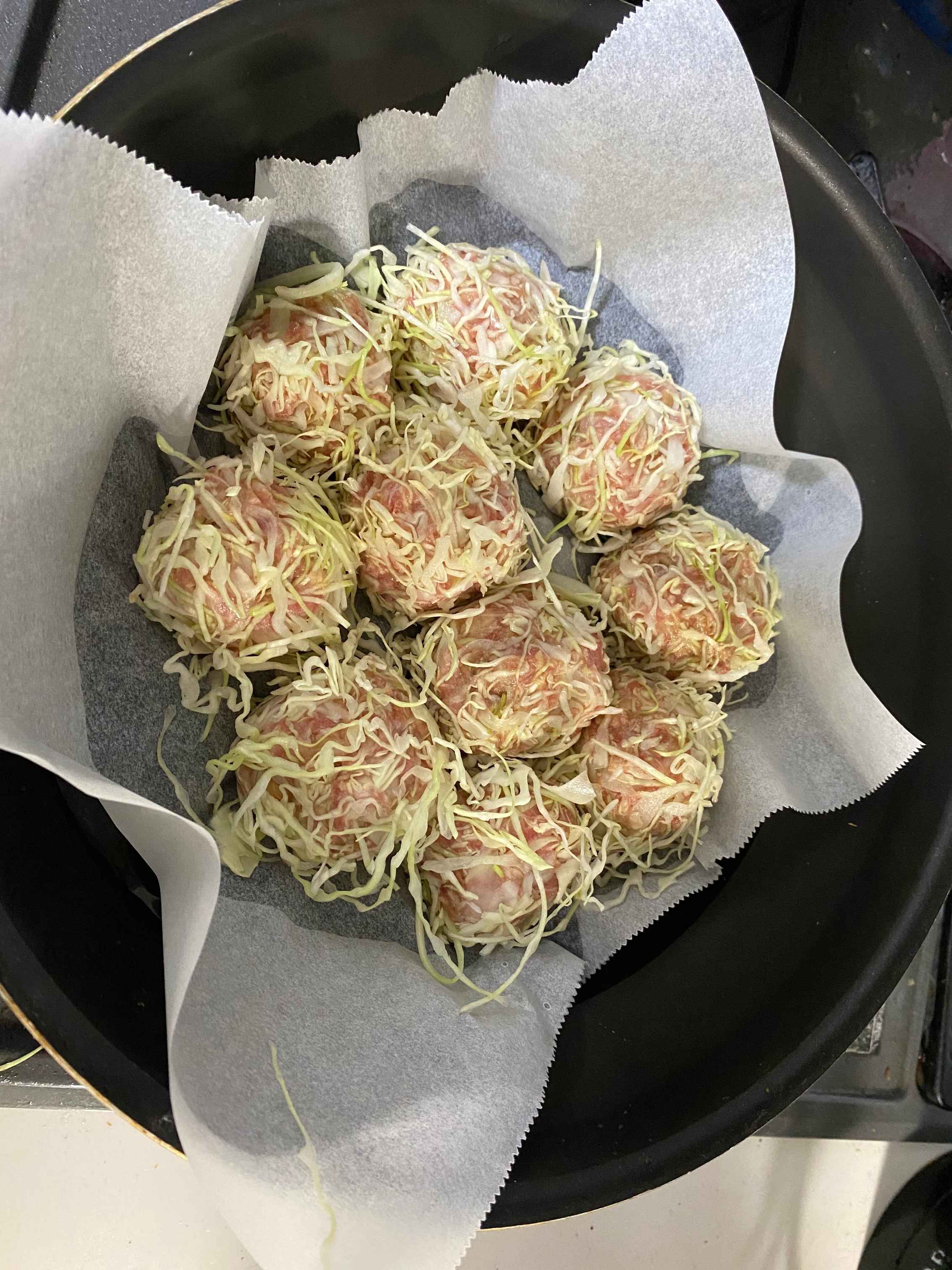 7.フライパンに水を入れ、クッキングシートを敷き、6のシュウマイを並べる。
