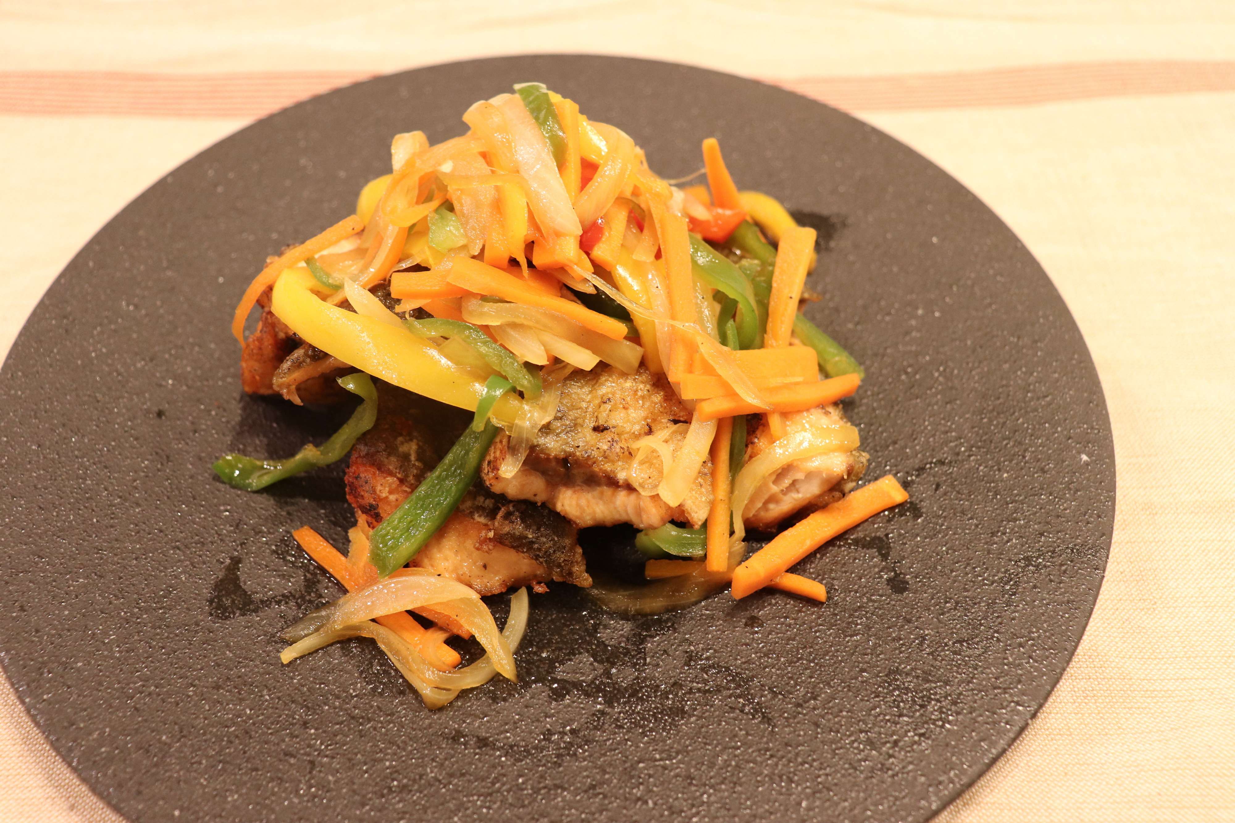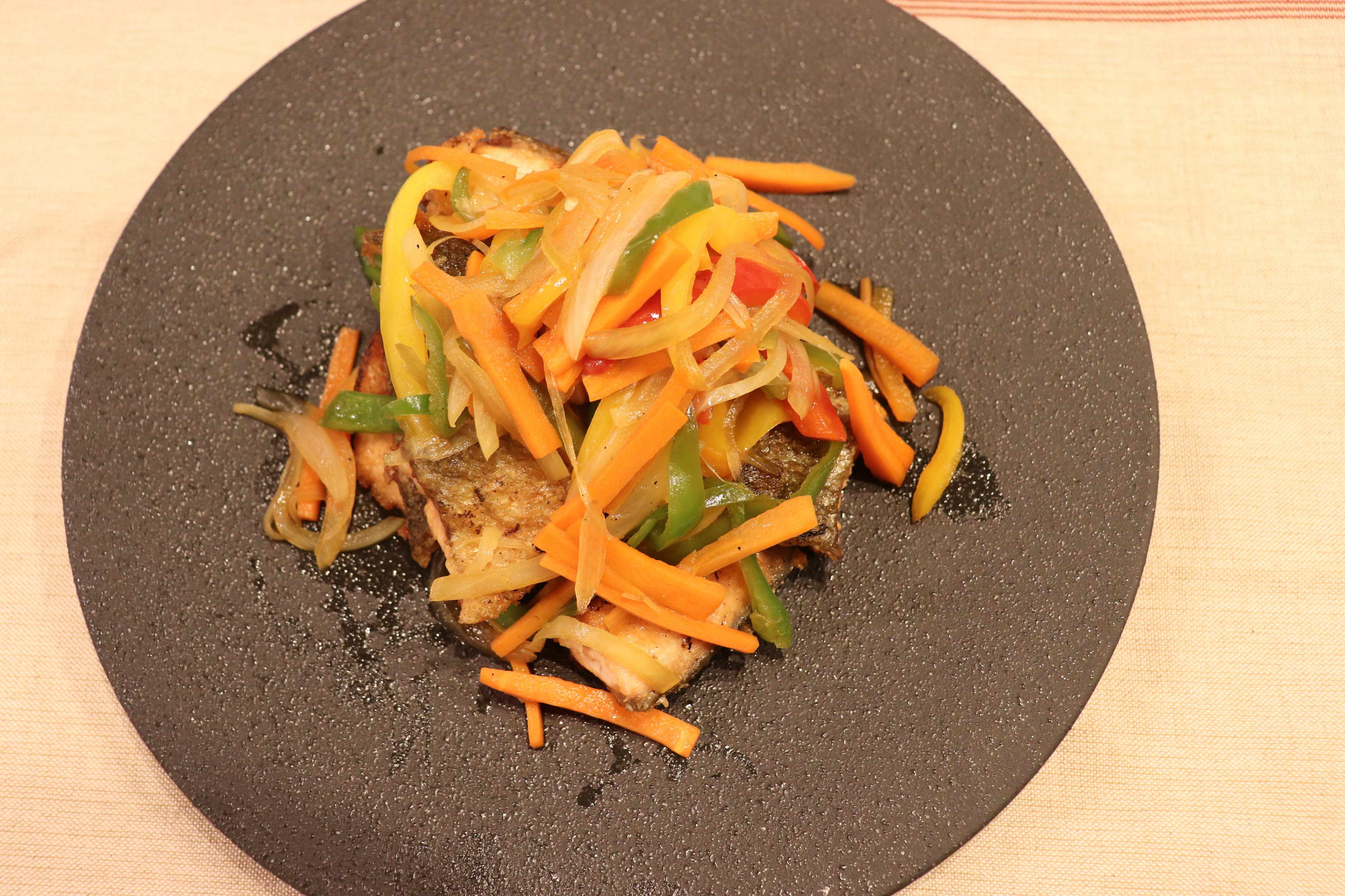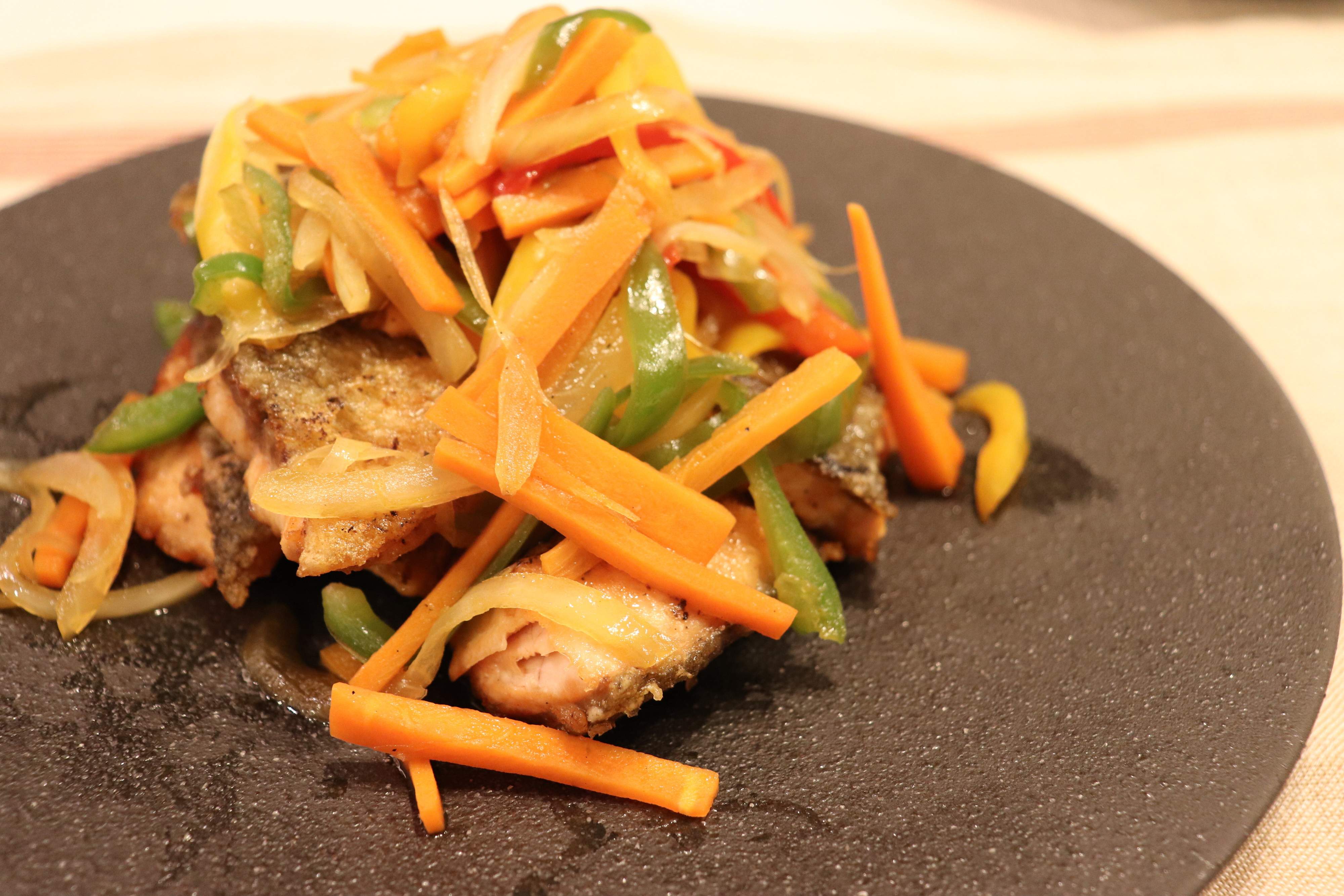 6.両面を焼いて鮭に火が通ったら、お皿に盛り、上から4の野菜と漬けだれをかけて出来上がり!