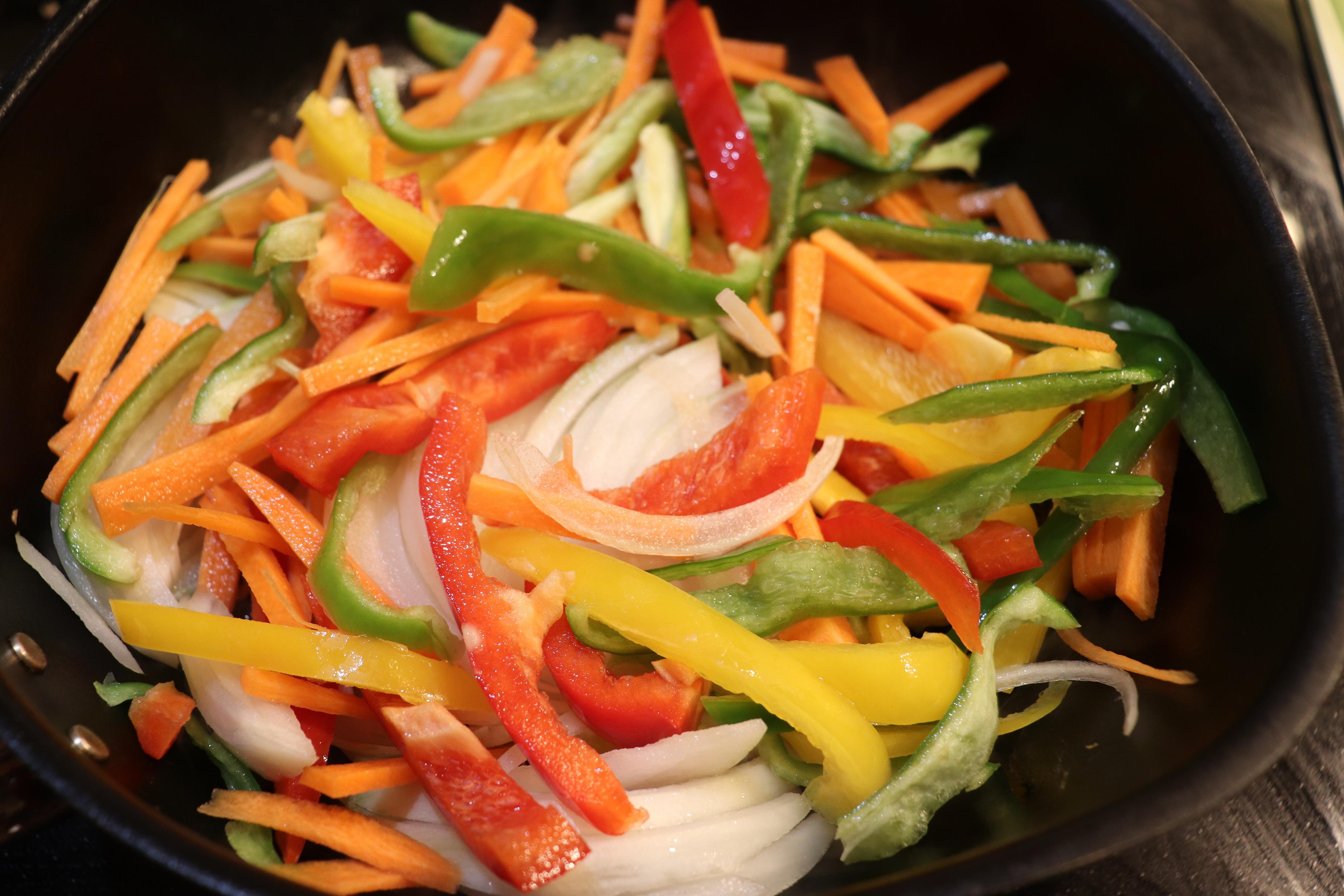 2.玉ねぎは薄切り、他の野菜は大きさをそろえて千切りにする。