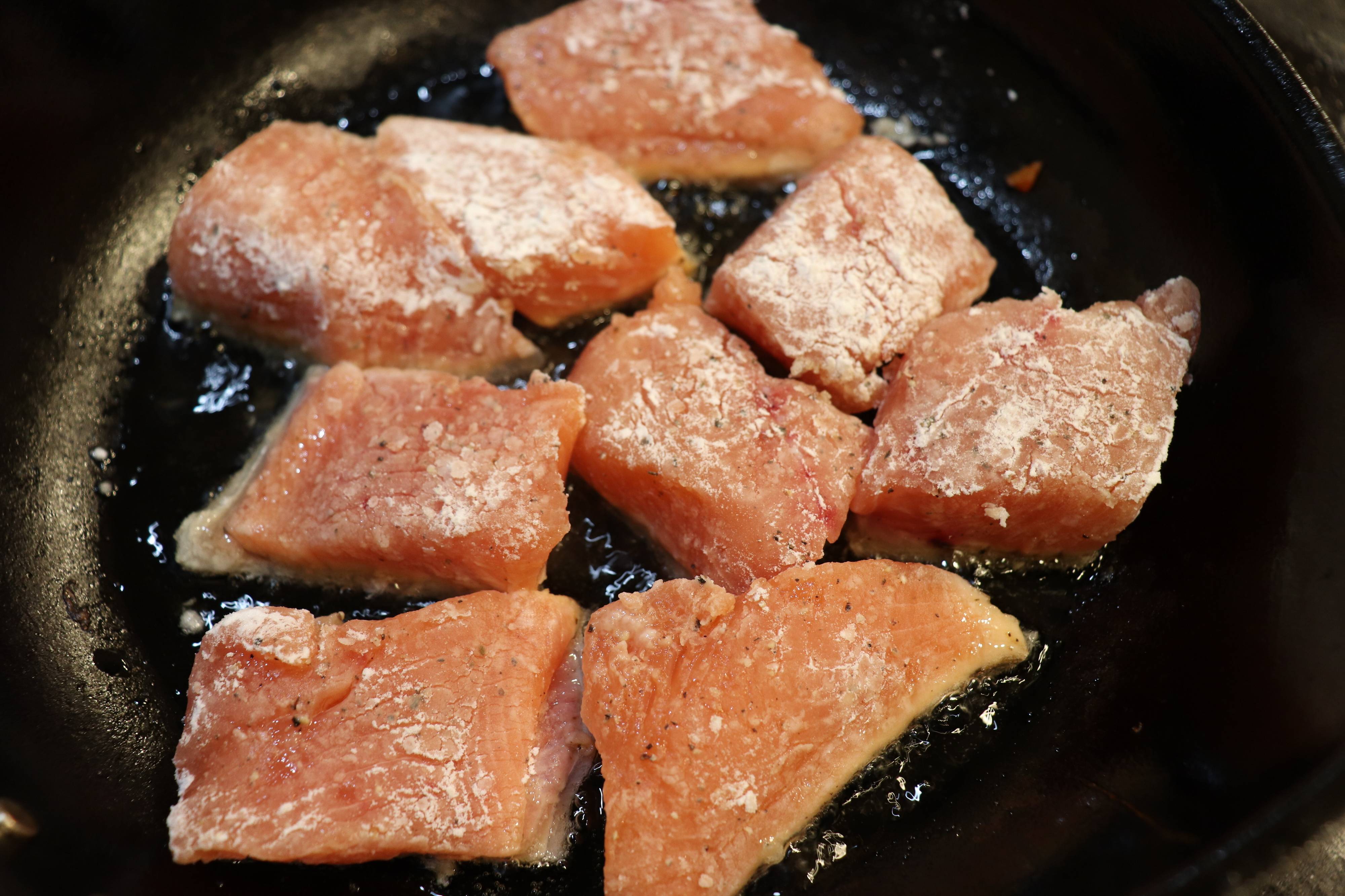 5.生鮭に片栗粉を振り、フライパンに油を多めに加えて熱し、生鮭の皮目の方から揚げ焼きにする。皮目の方は、カリッとするまでしっかりと焼く。
