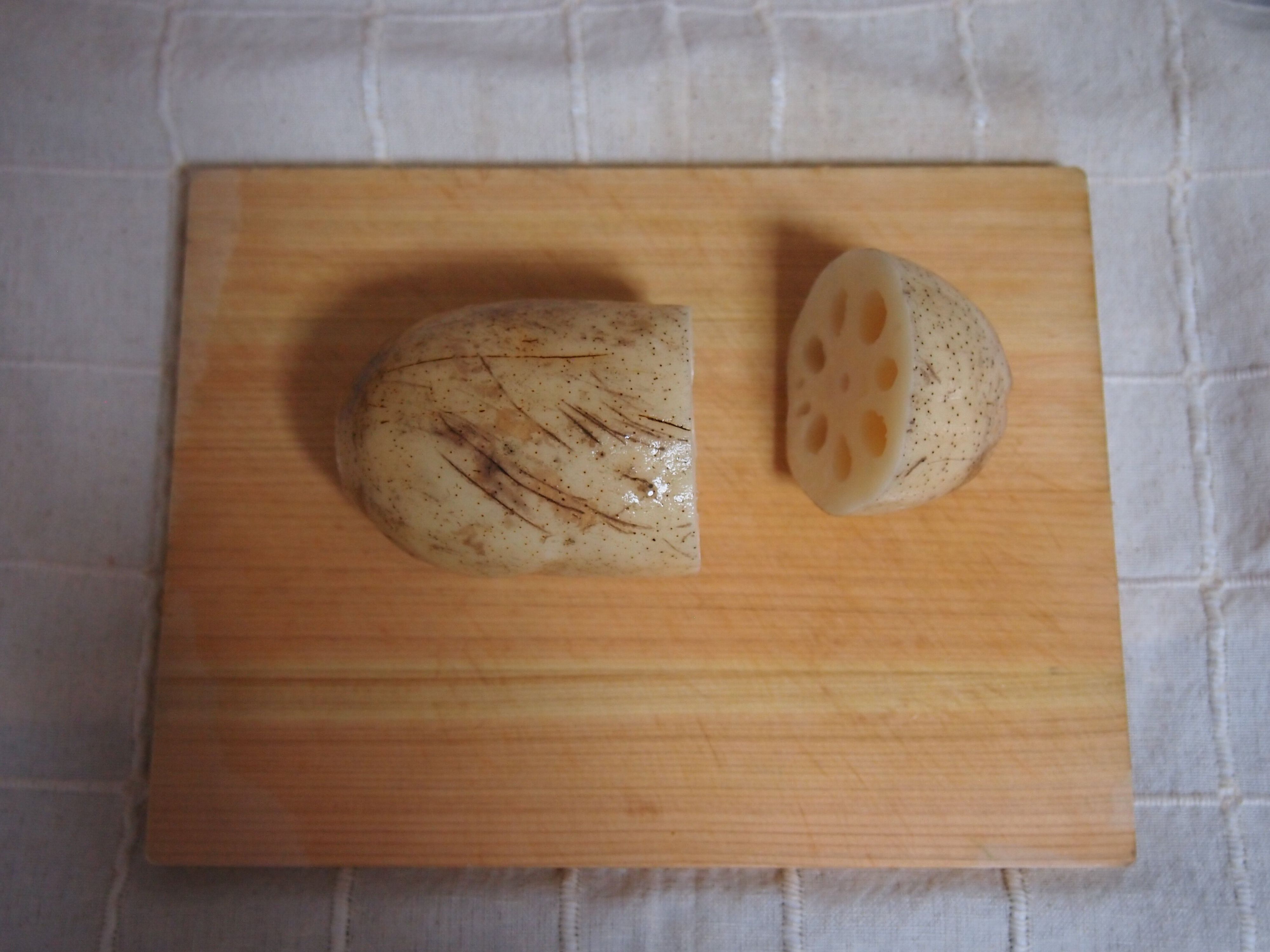 (1)レンコンはおろす用、刻む用に切る。だいたい、おろす用が2/3程度と多めになれば大丈夫です。