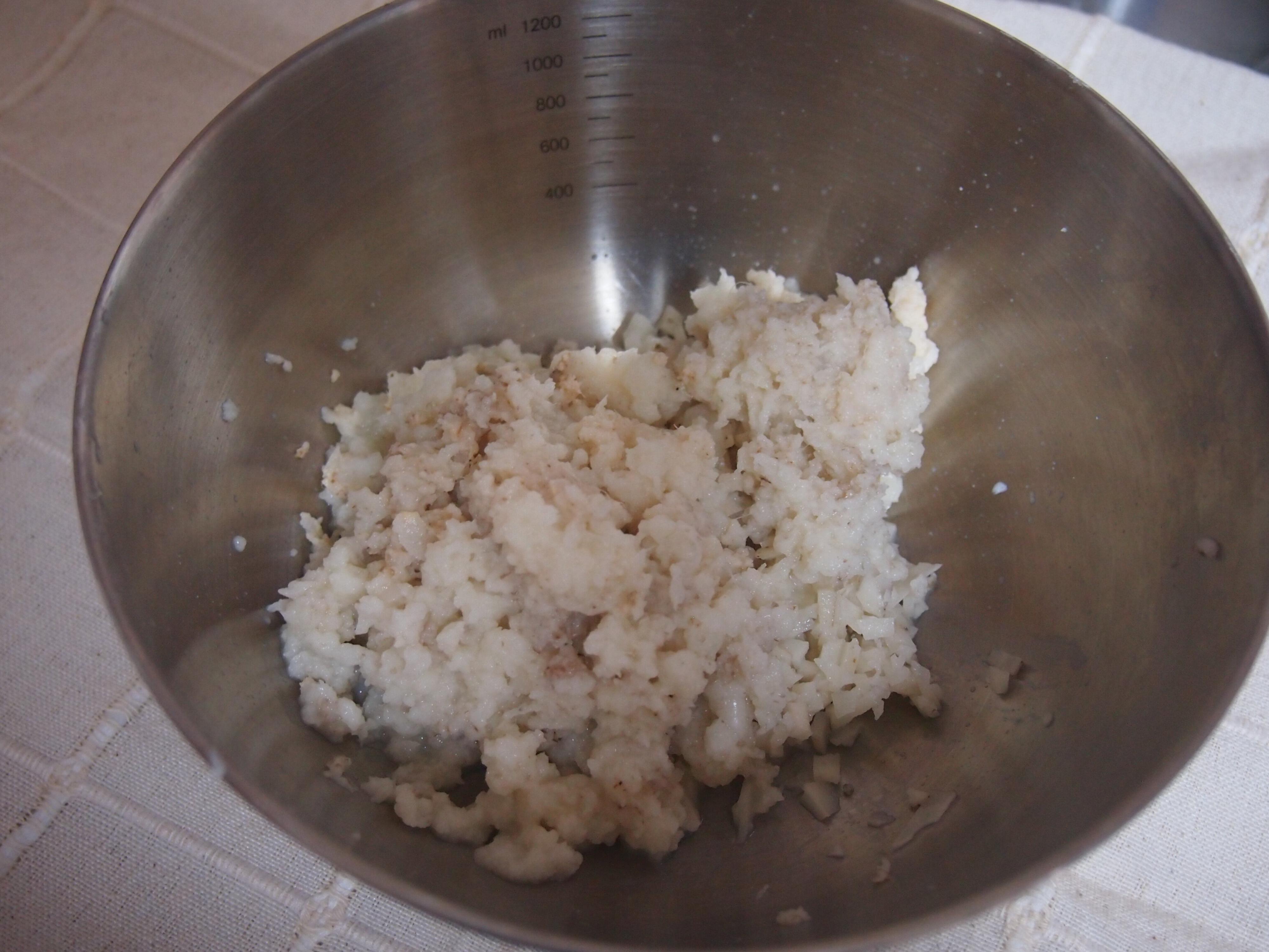 (2) 「おろす用」のレンコンは皮ごとおろす。「刻む用」は皮ごと粗みじん切りにする。