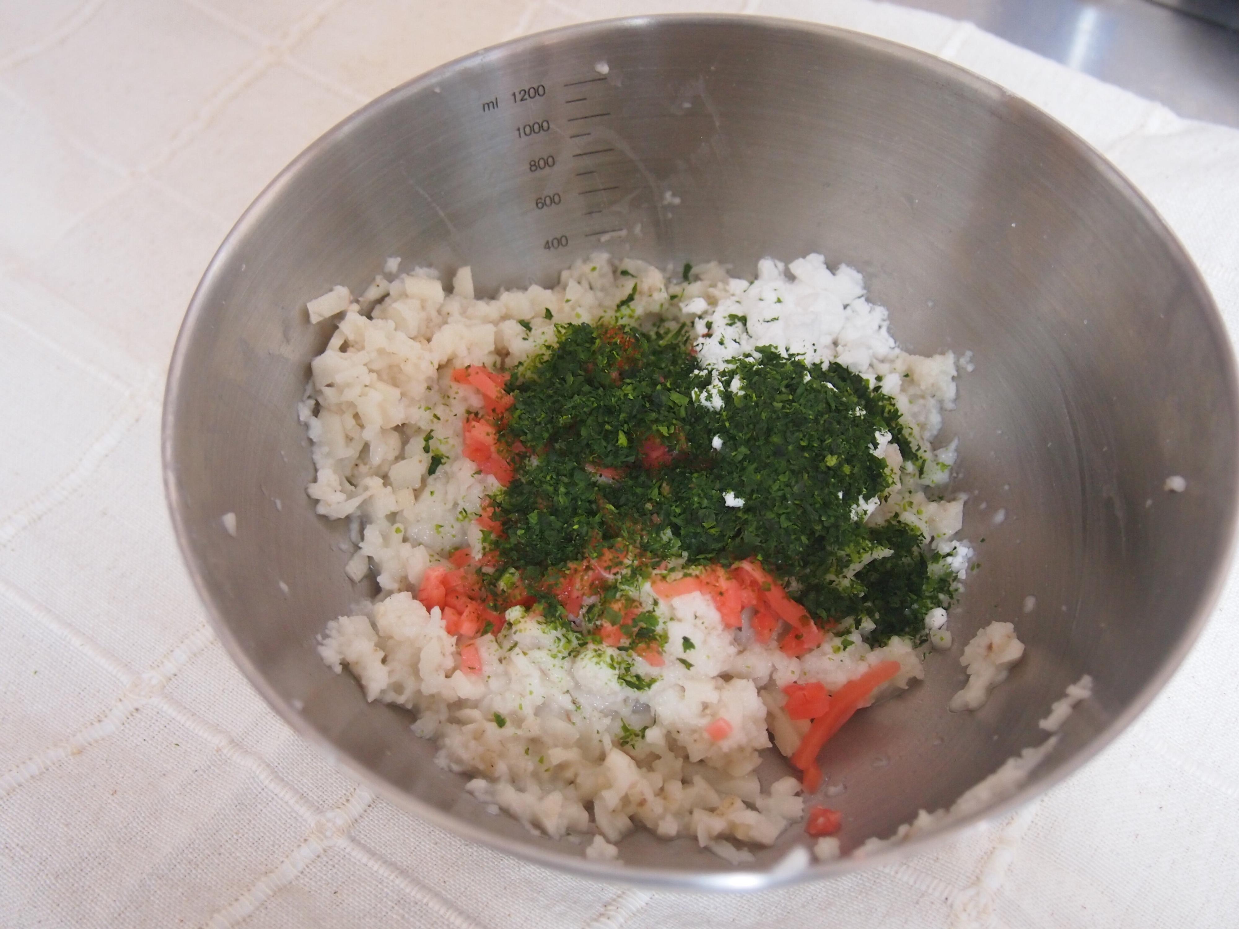 (3) (2)に片栗粉、塩、こしょう、青のり、紅生姜を加え混ぜる。