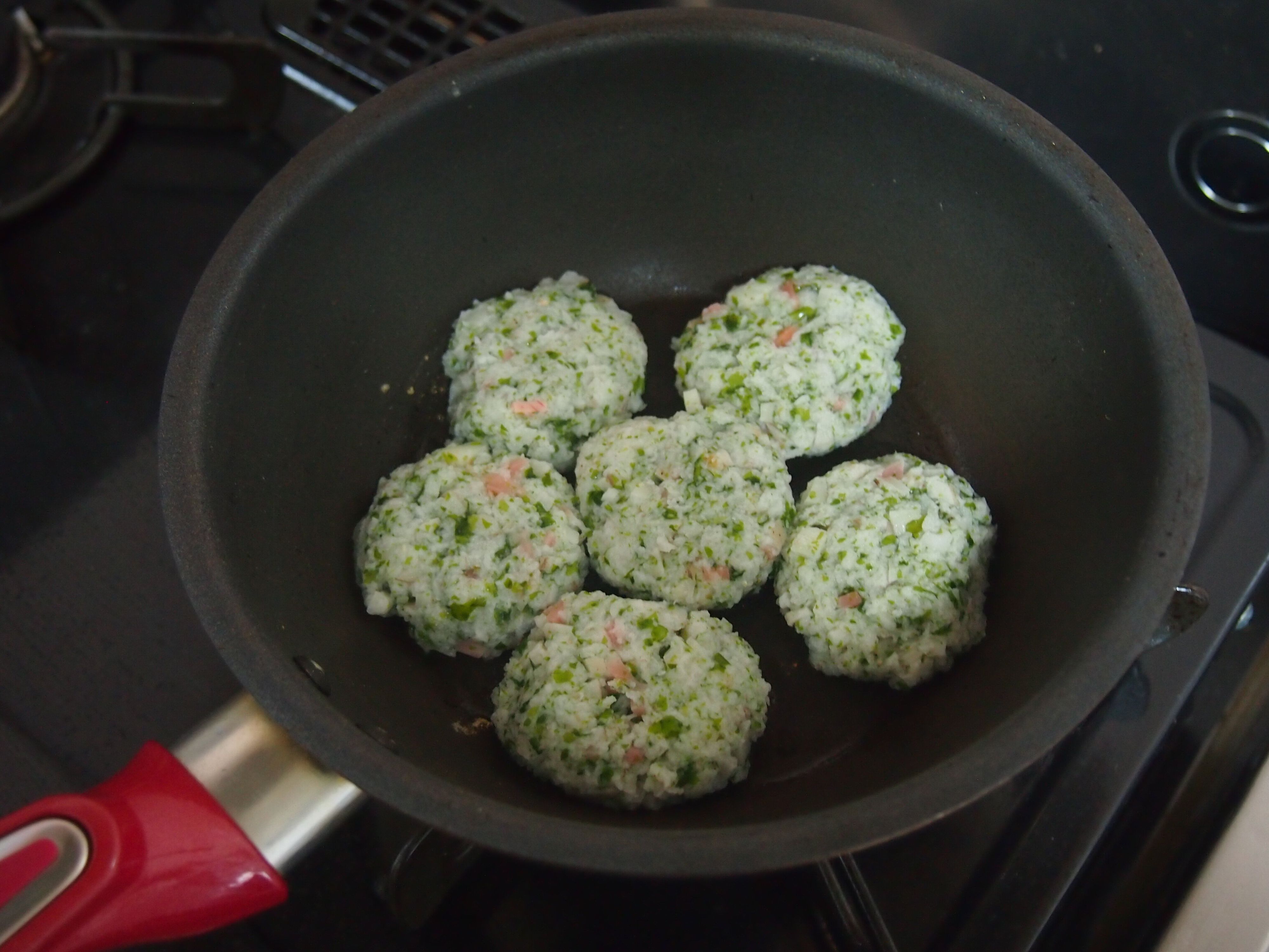 (4) ざっくり6等分にし、小判型に丸める。レンコンから水分が出てくるので軽く絞ると、まとまりやすくなる。