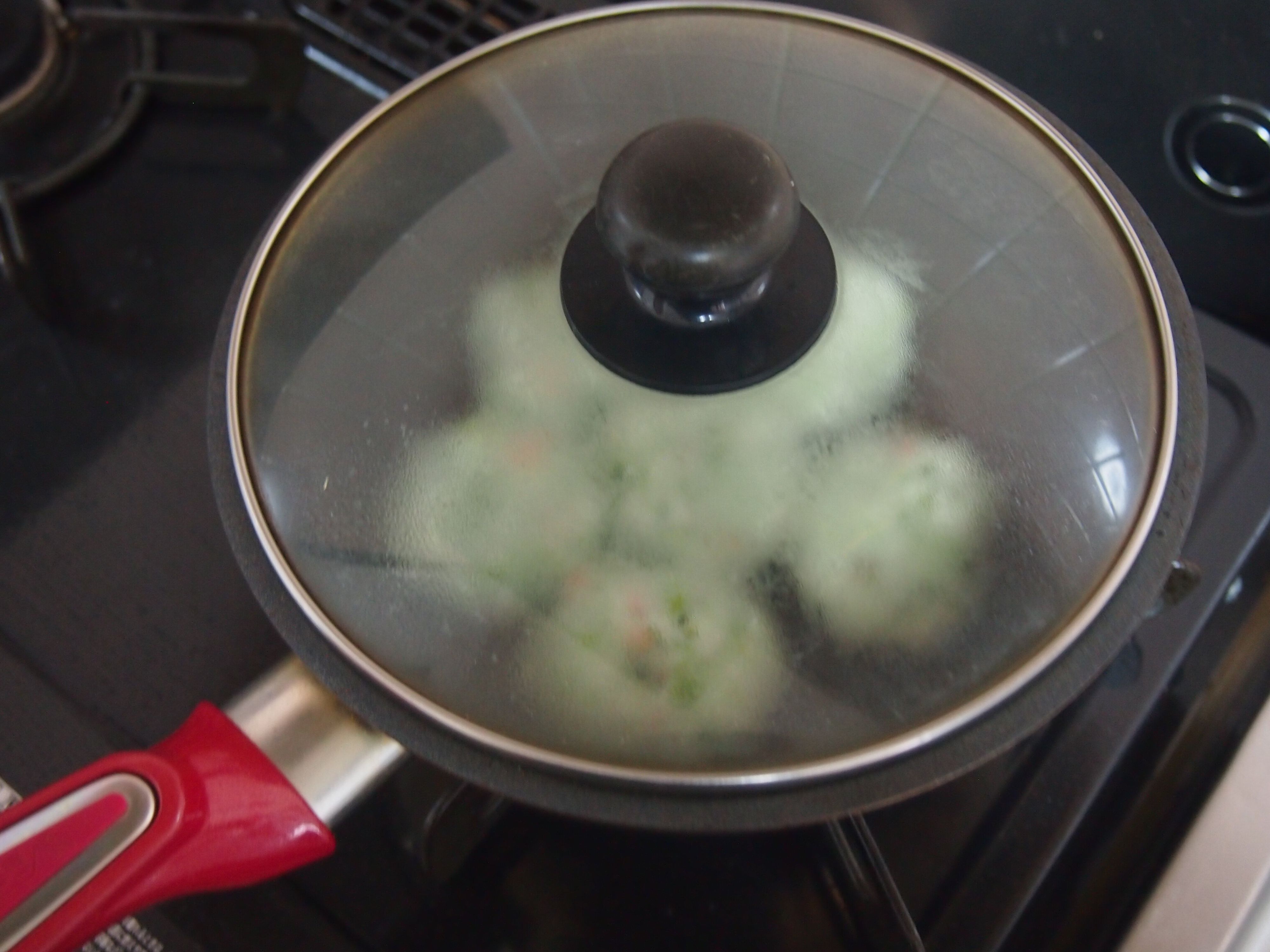 (5) フライパンに油を入れて、中火にかけフタをして片面4〜5分焼く。ひっくり返し3分焼く。お好みでソースをかける。