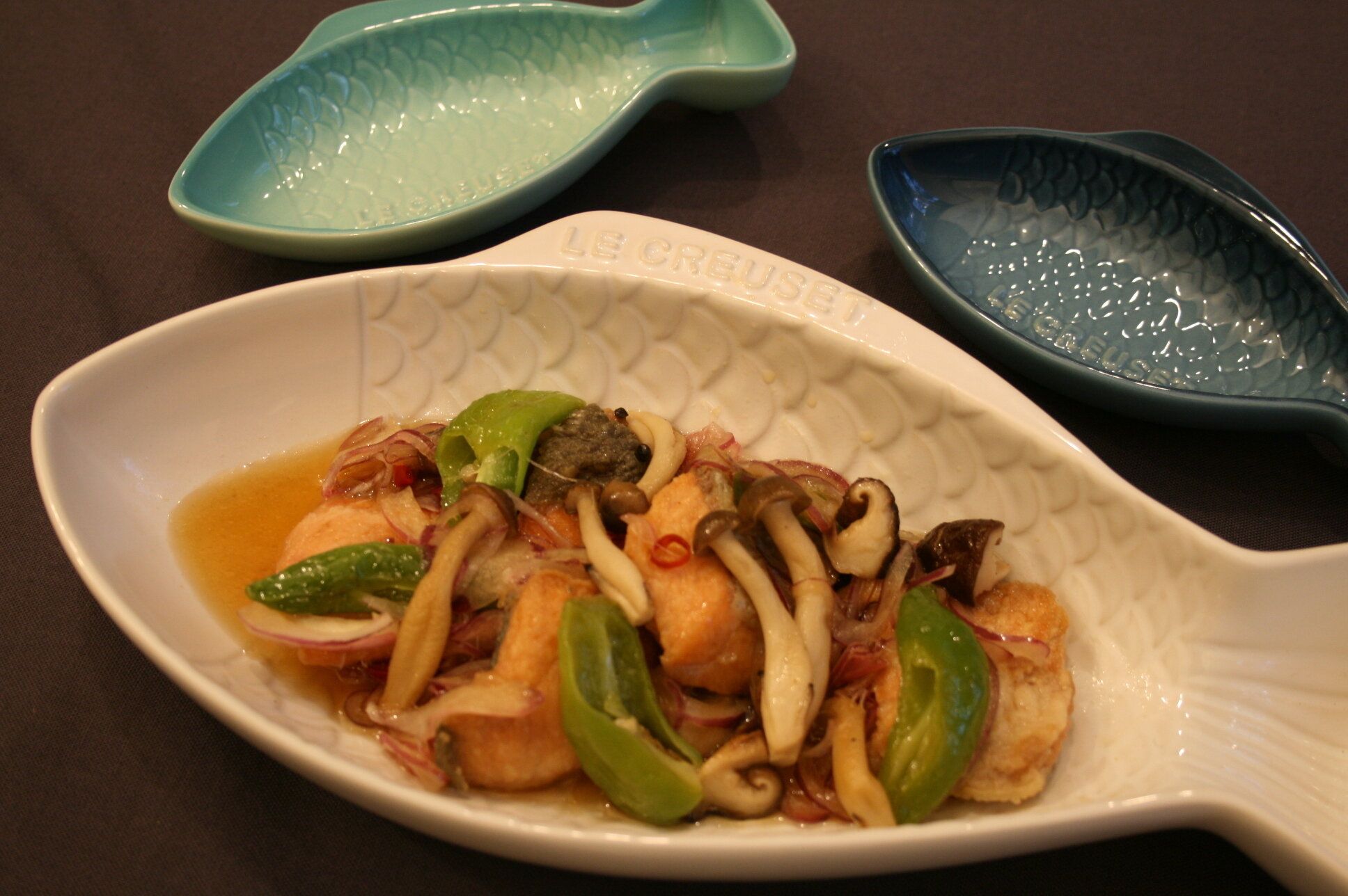 5.フライパンにサラダ油を2cmほど入れ、170度でしいたけ・しめじ・しし唐をさっと揚げる。