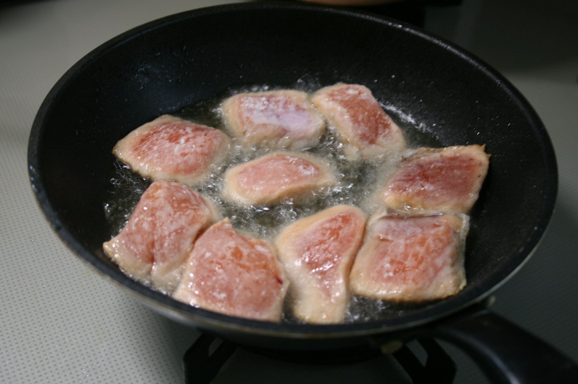 6.鮭に小麦粉を軽くはたき皮面から揚げていく。