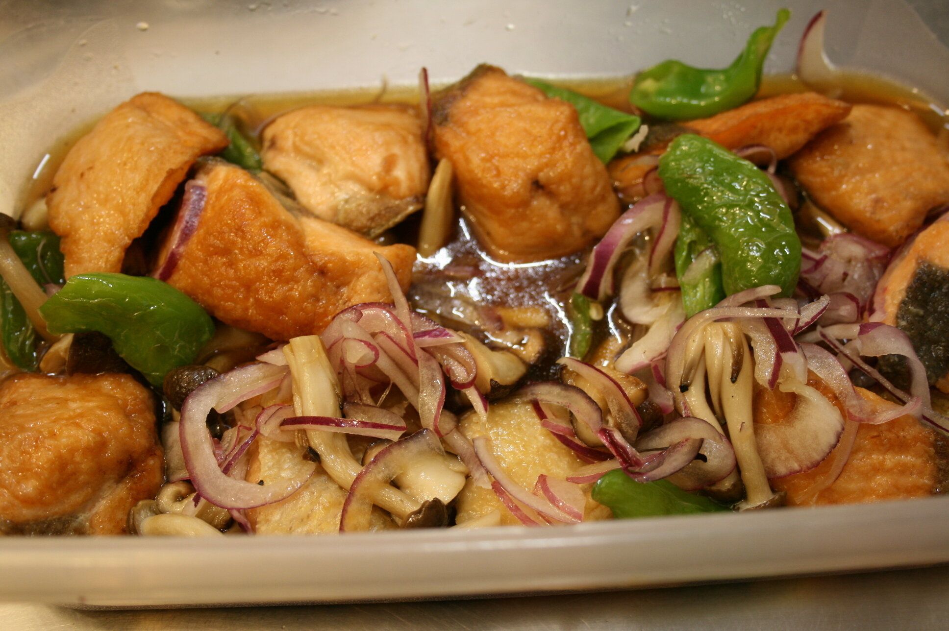 7.油を切った鮭と野菜を熱いうちに南蛮酢に漬ける。