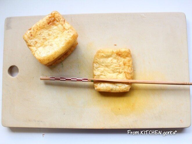 (1)油揚げをまな板に置き、箸などでコロコロさせて、ハサミで口を開き、熱湯をかけて油抜きをしておく。