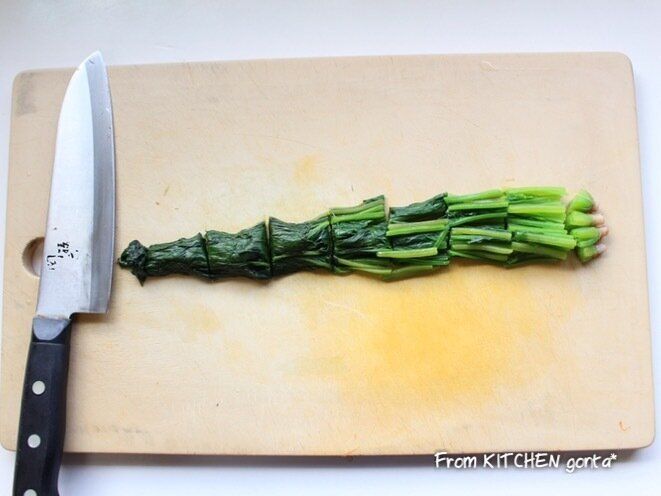 (2)ほうれん草をレンジで600W1分20秒加熱して、水気を切り、3cm幅に切る。