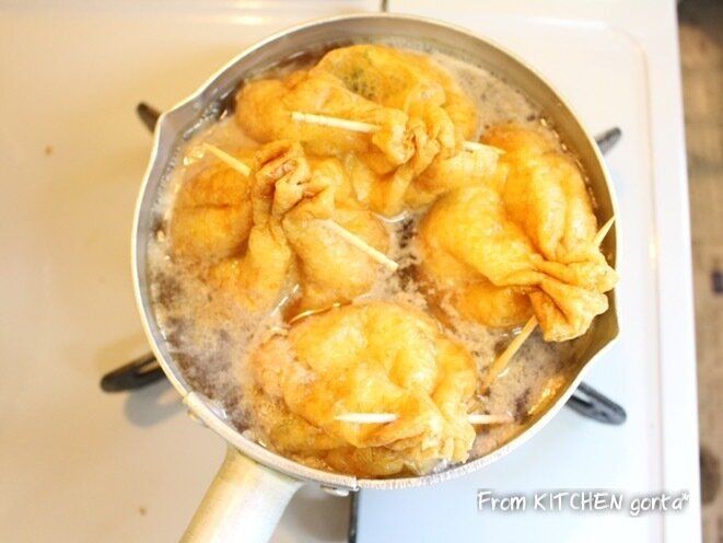 巾着を煮込む時に、出汁が程よく残る程度に煮込むのがポイントです。
