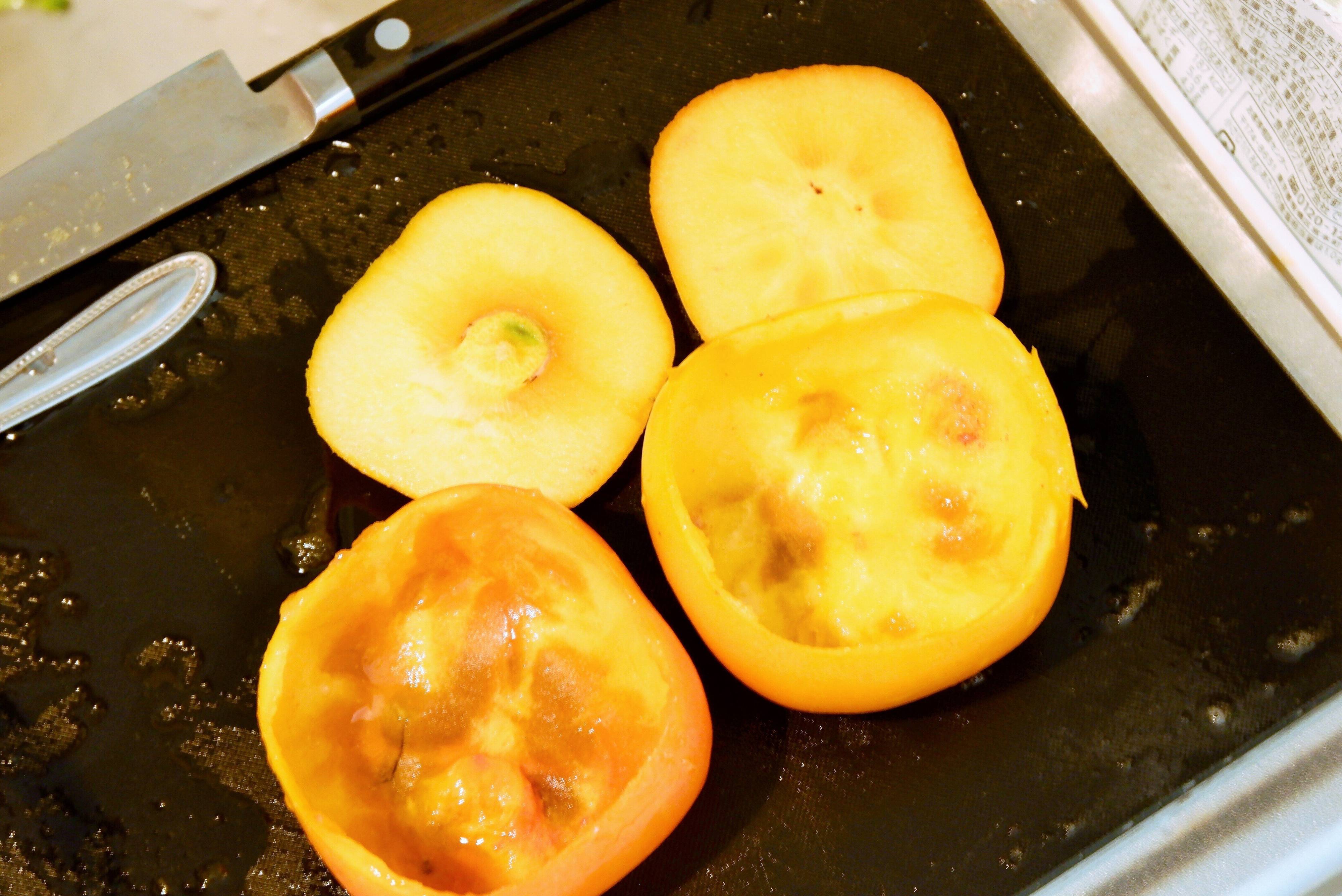 ふだんは硬い柿が好きなのですが、見切り品コーナーに熟れた柿があるとついつい買ってしまいます。