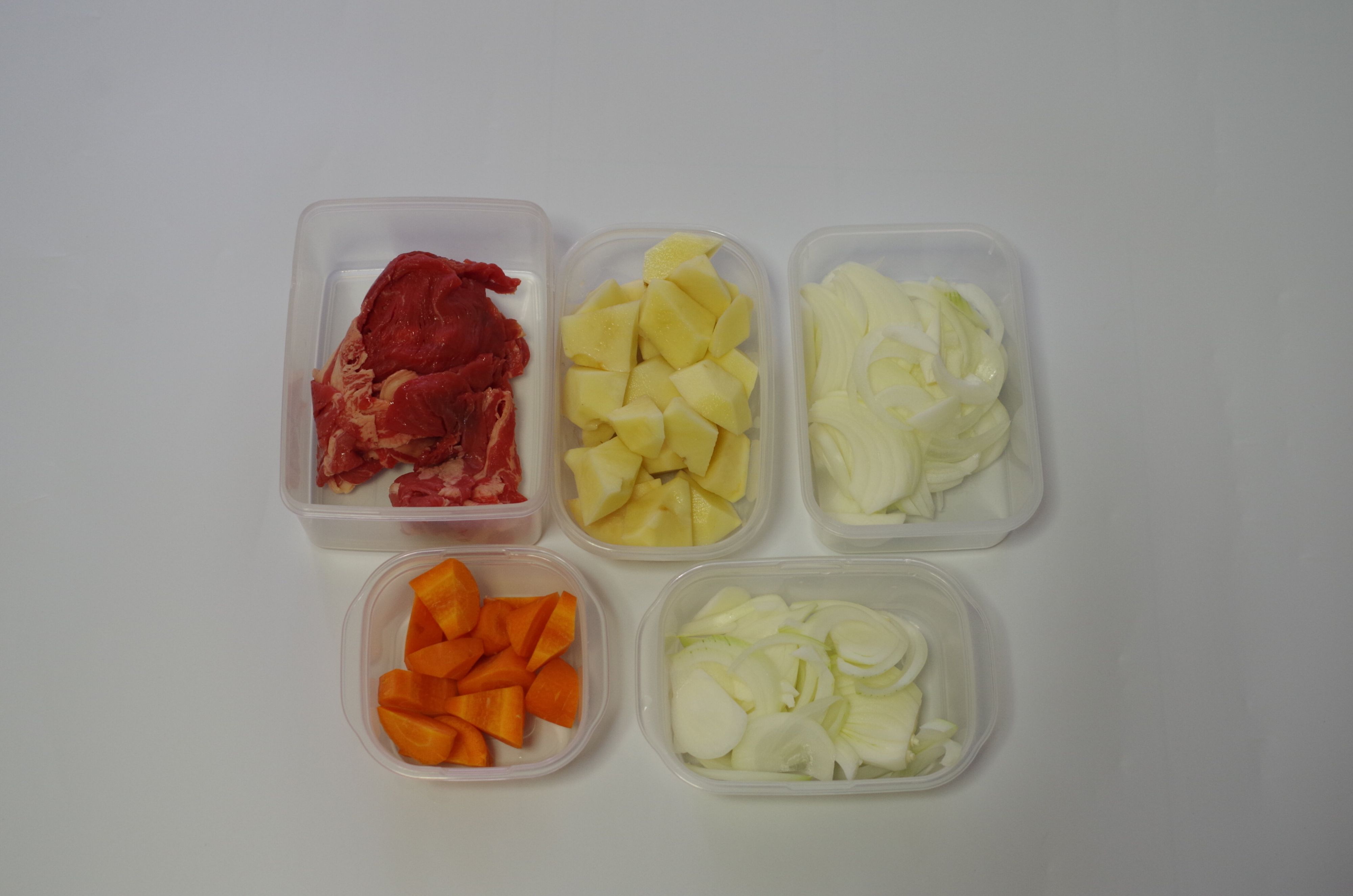 牛肉200g程度、ジャガイモ大2個、玉ねぎ2個、にんじん1本
