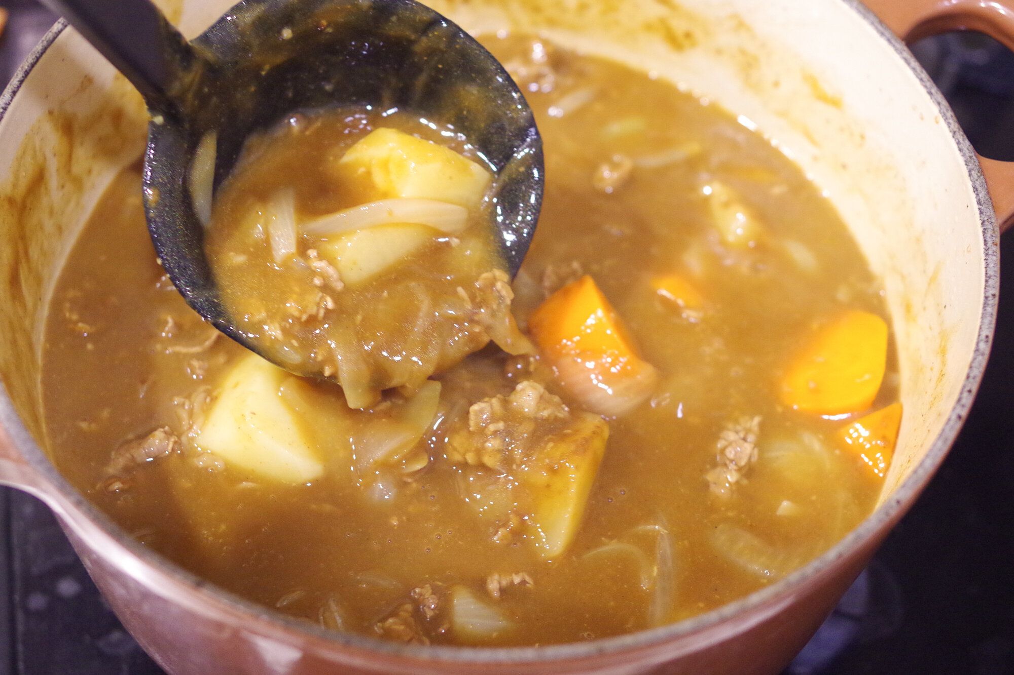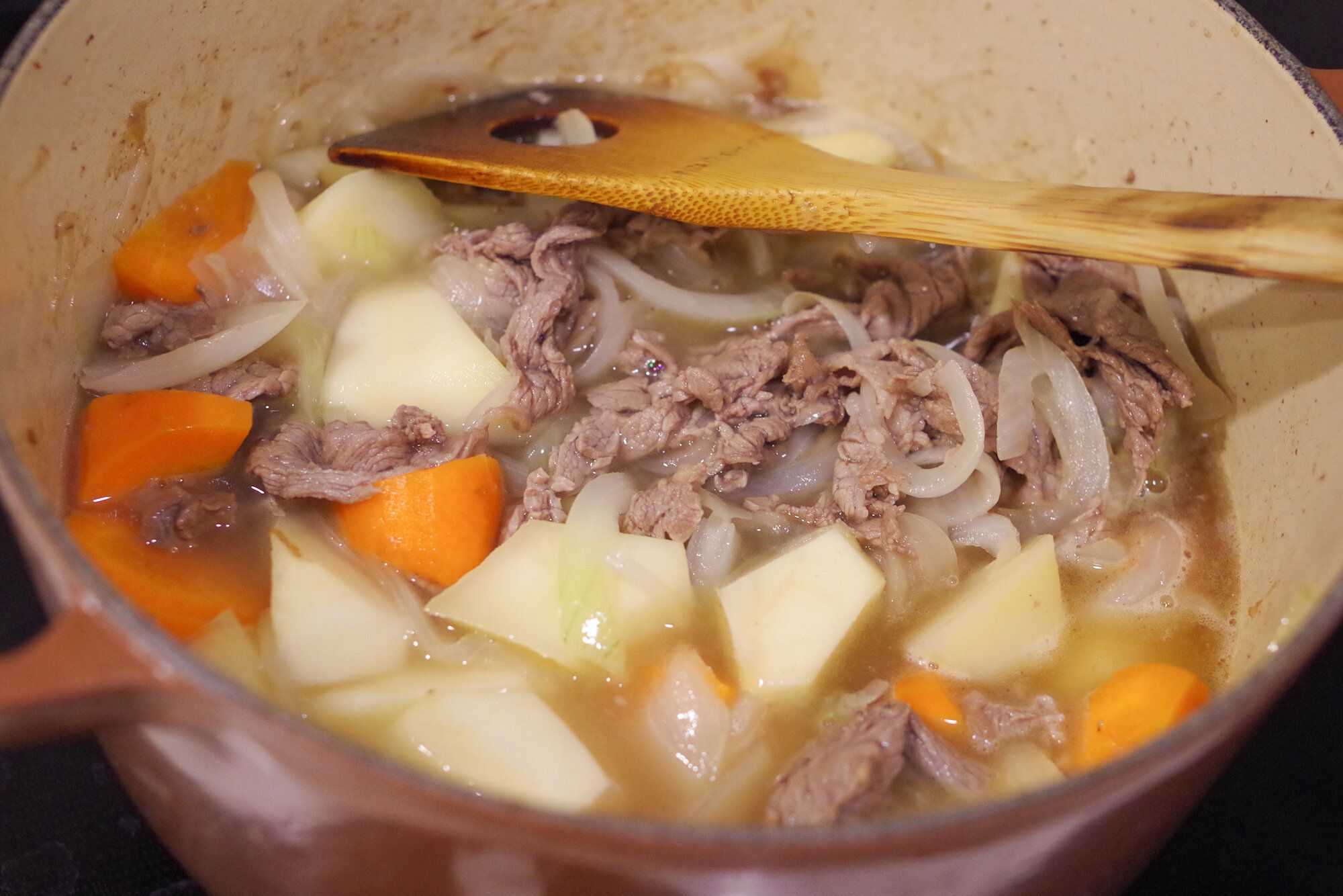 ここから先の具材を入れる工程はいたって普通です。ジャガイモを入れた後に煮詰める際の水の量は、やや少なめに。味を凝縮させて、最後に水分量を調整しています。