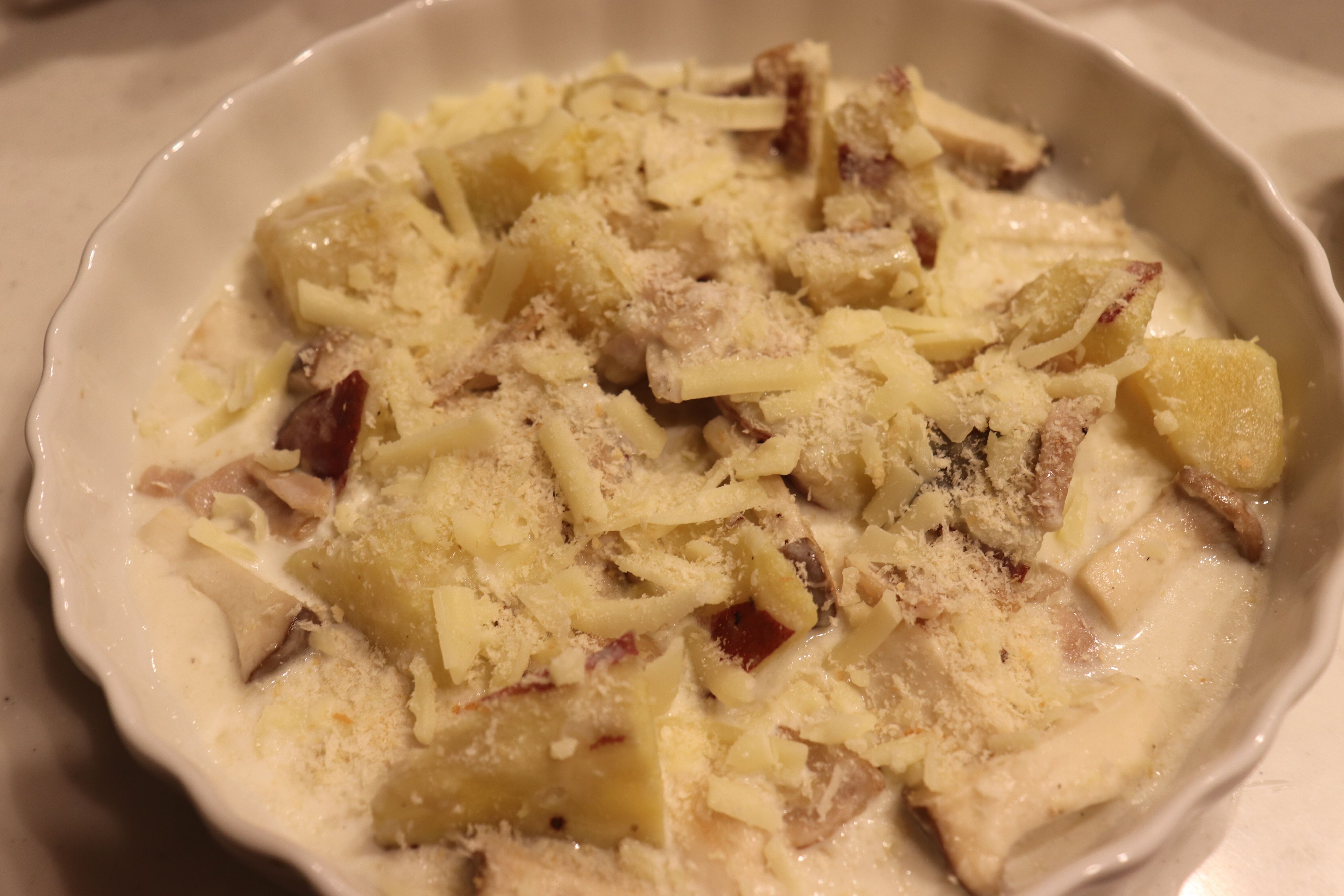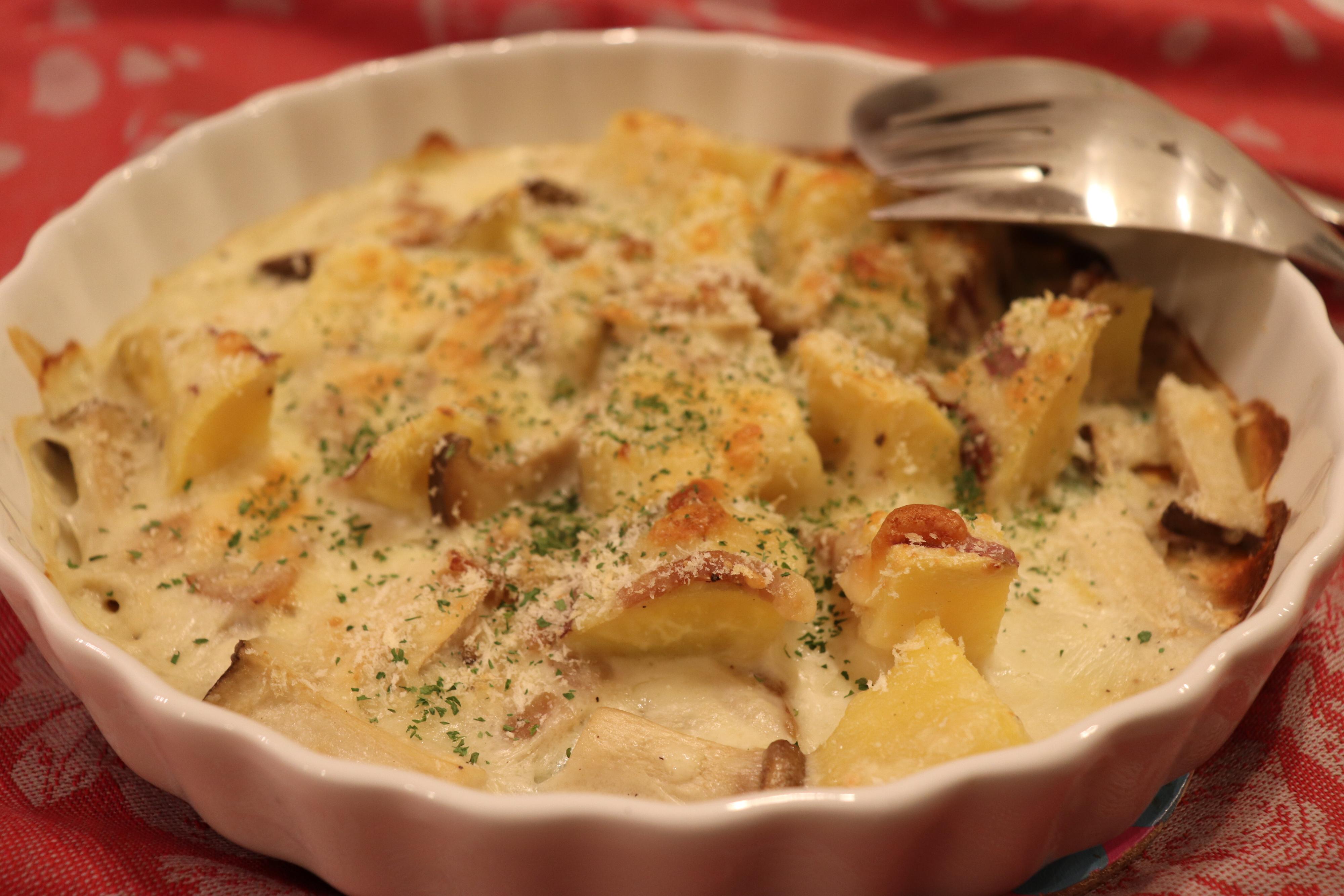 旬のさつまいもを使った、ホクホクの簡単グラタンをご紹介!冷蔵庫にあるもので、あっという間につくれるグラタンです。今回は、さつまいものほかに、エリンギを入れてつくりました。