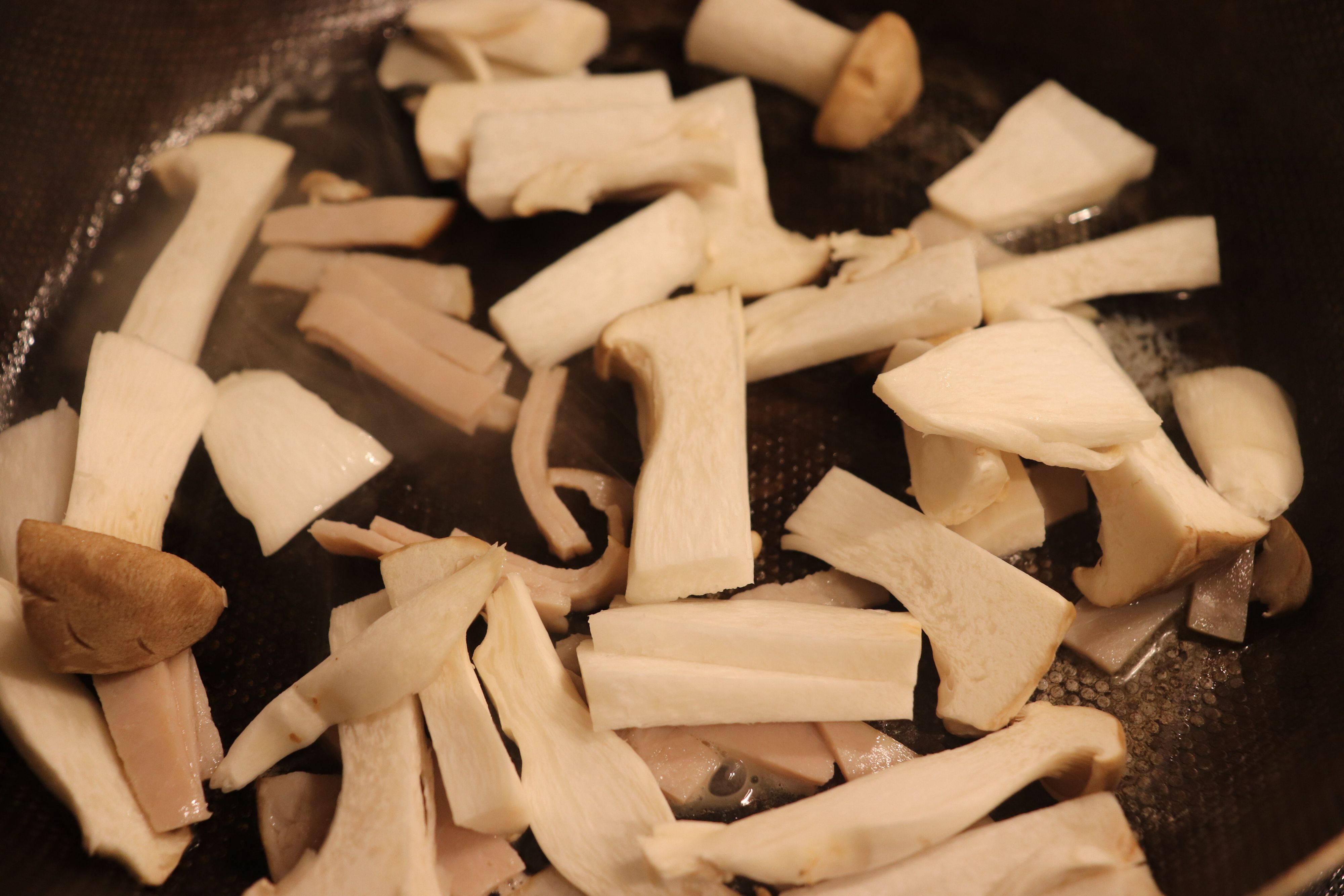 エリンギは縦に適当な大きさに切る。無塩せきハムも適当な大きさに切る。