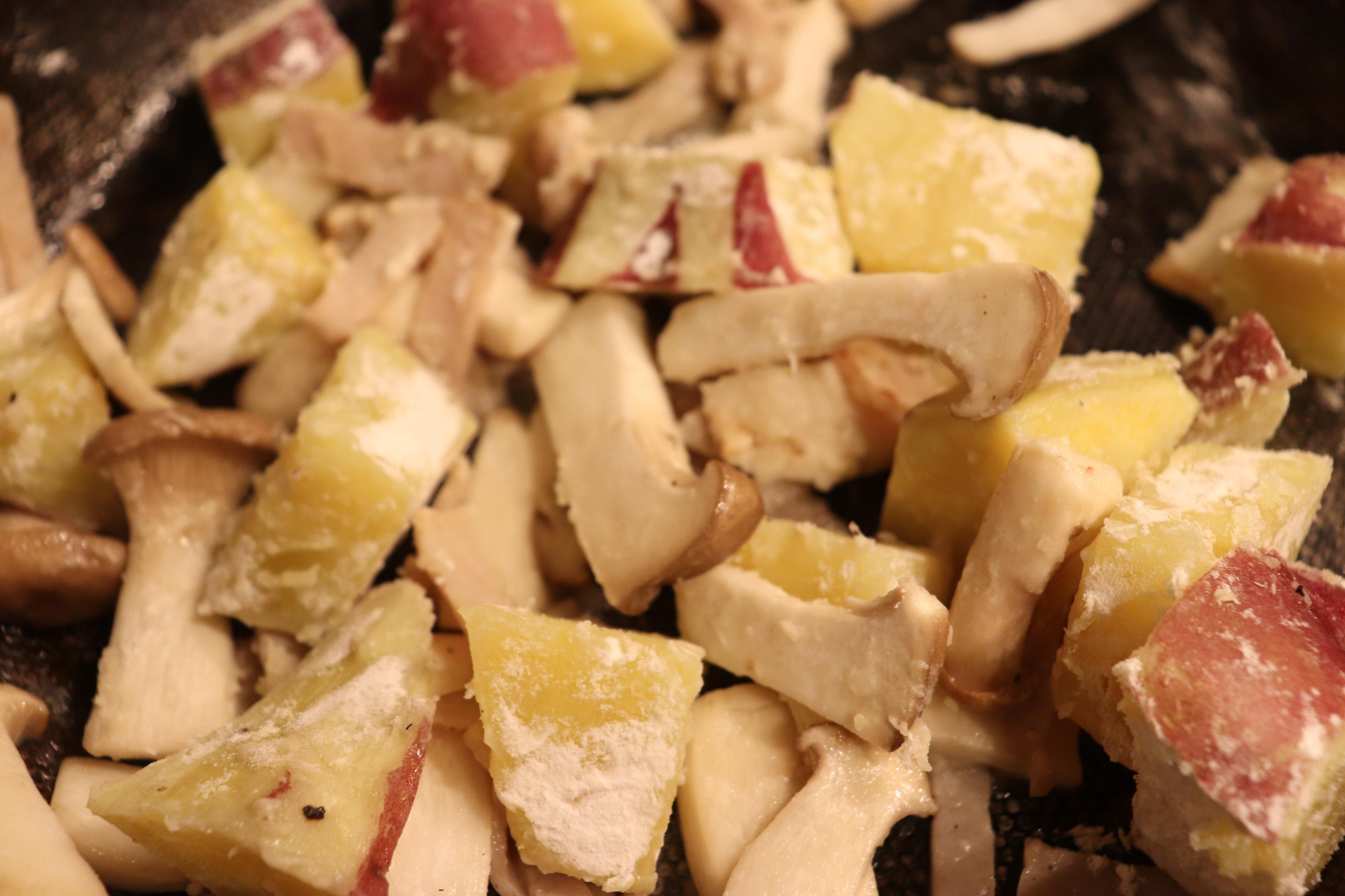 3.蒸かしたさつまいもを入れて、軽く炒める。塩、胡椒を振り、小麦粉を入れてさらに炒める。