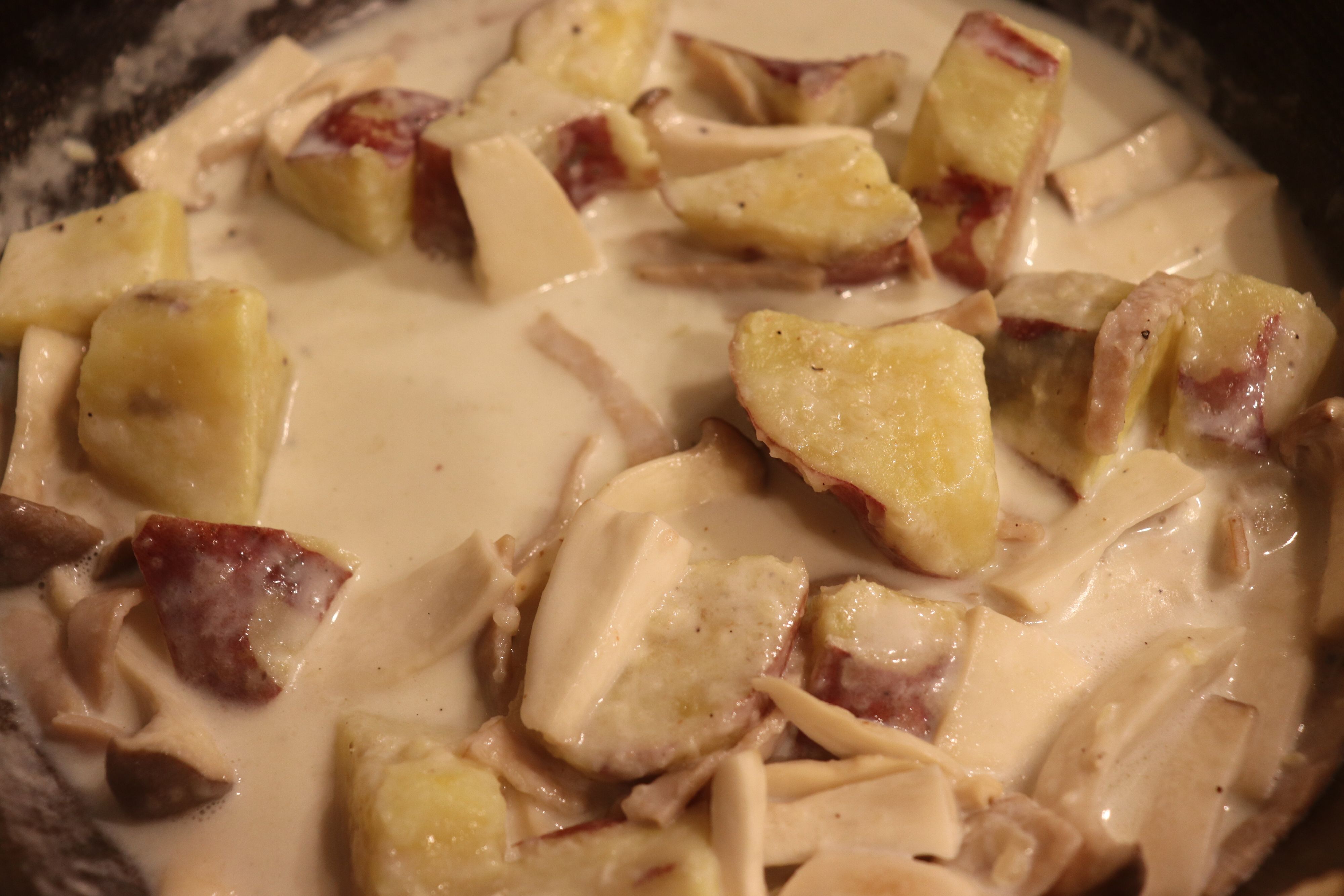 4.牛乳を入れて、かき混ぜながら軽く煮る。とろみがついてきたら、火を止める。