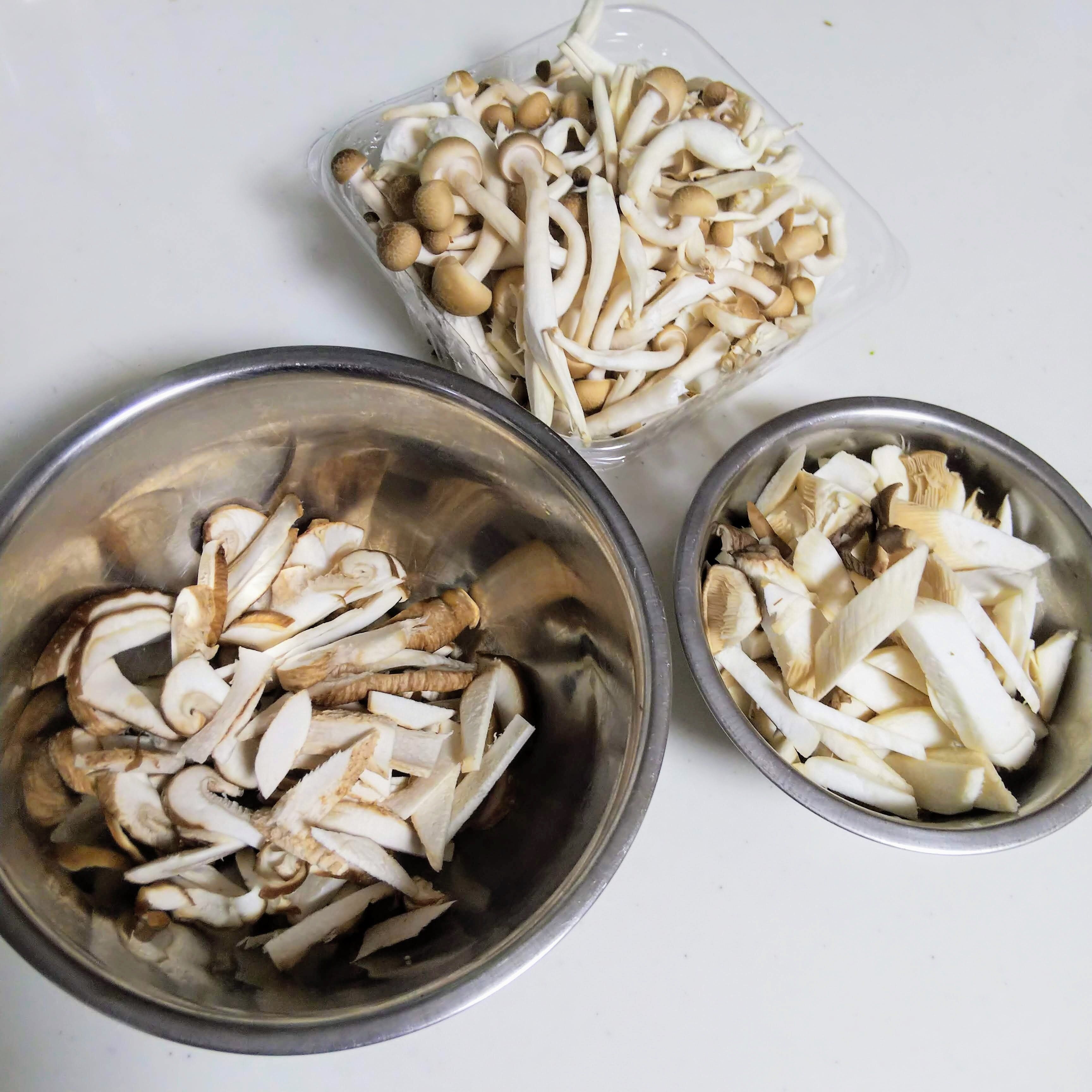 1 きのこをそれぞれ細切りにする(しめじやえのきは手で割いてもOK)。