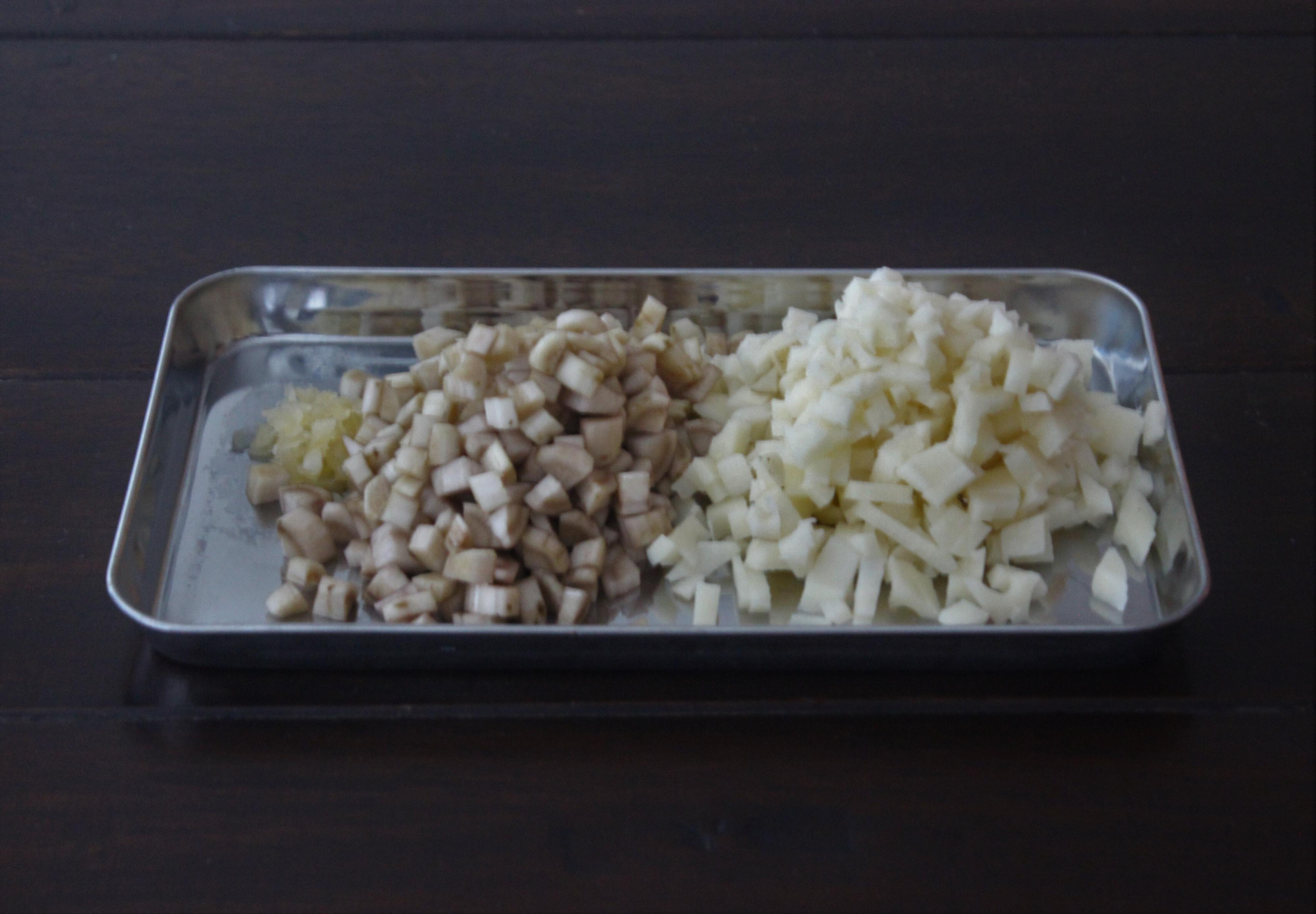 1.にらは3cm程度の長さにざく切り、にんにくはみじん切り、ごぼうと蓮根は粗く刻む。