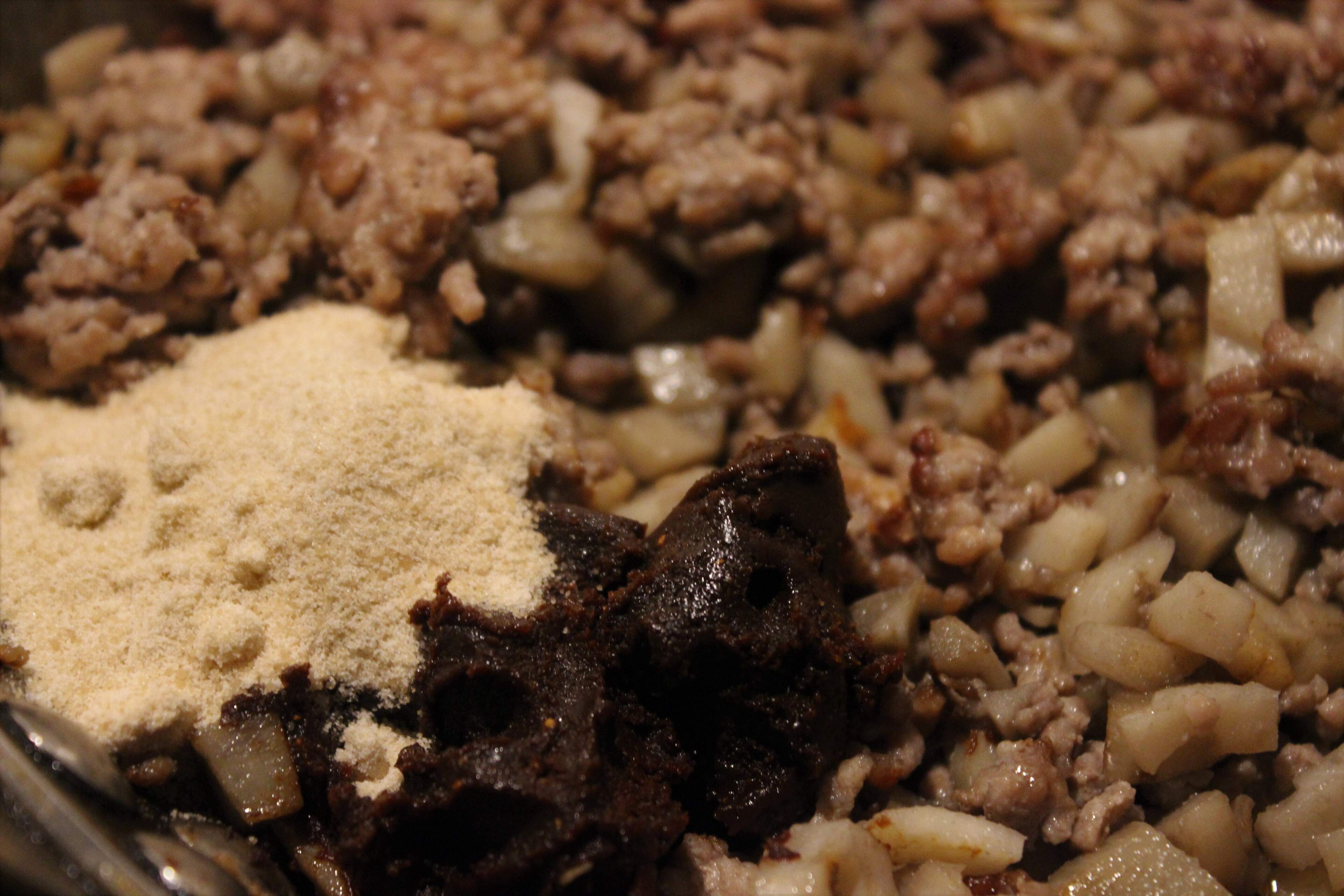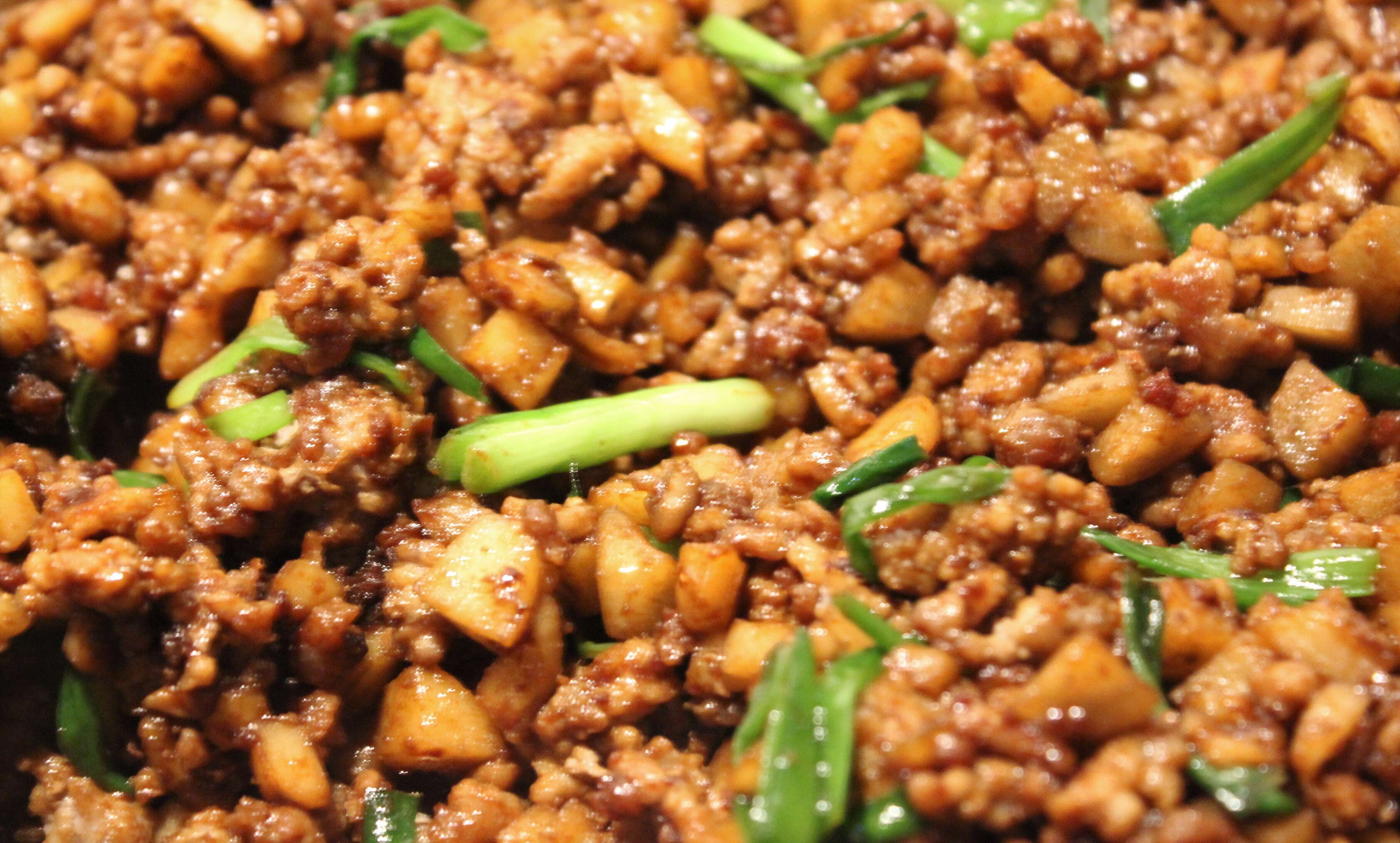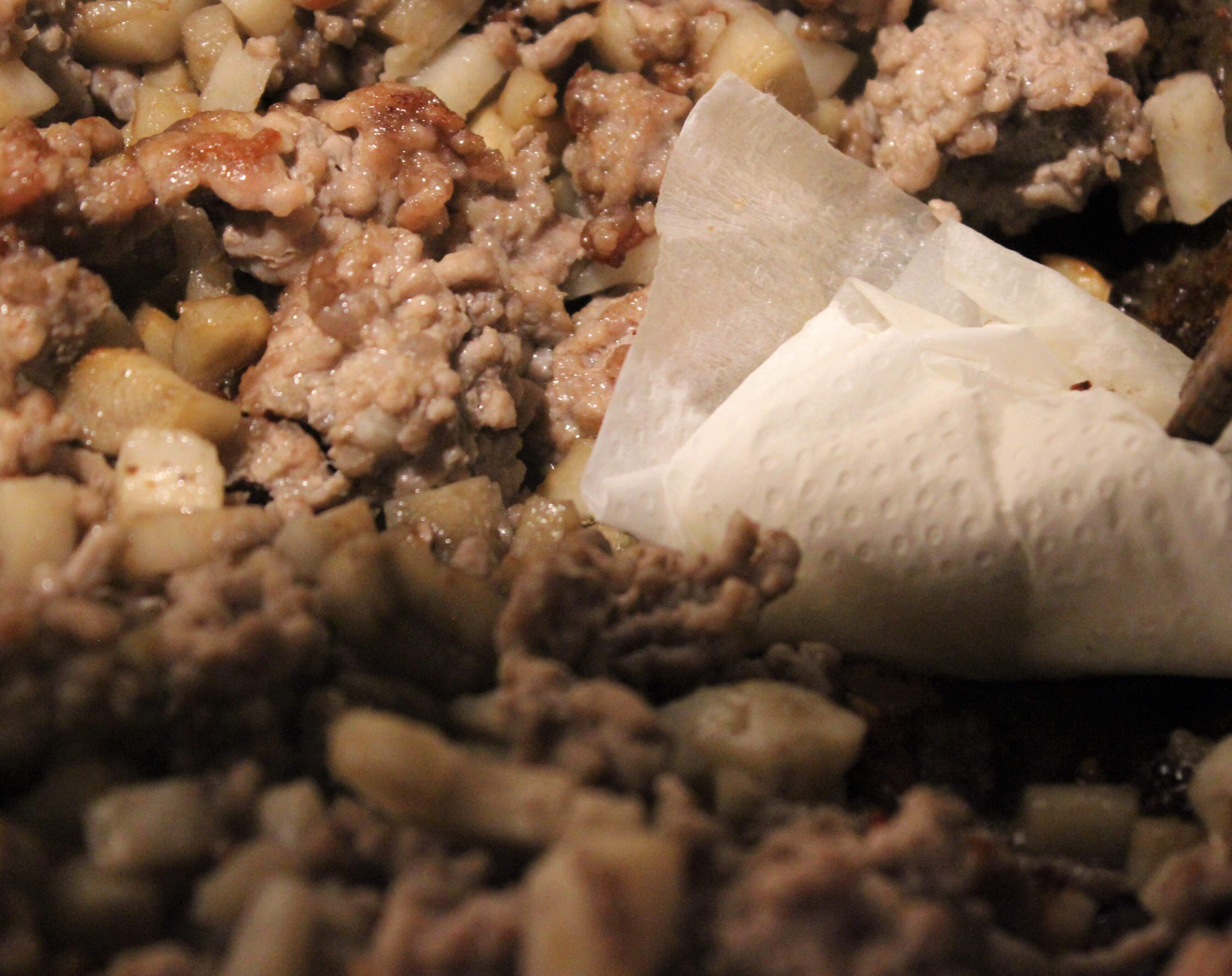 3.豚挽肉を加え、あまりいじらずにごろごろと塊が残るように炒める。肉に火が通ったら余計な油を取り除く。