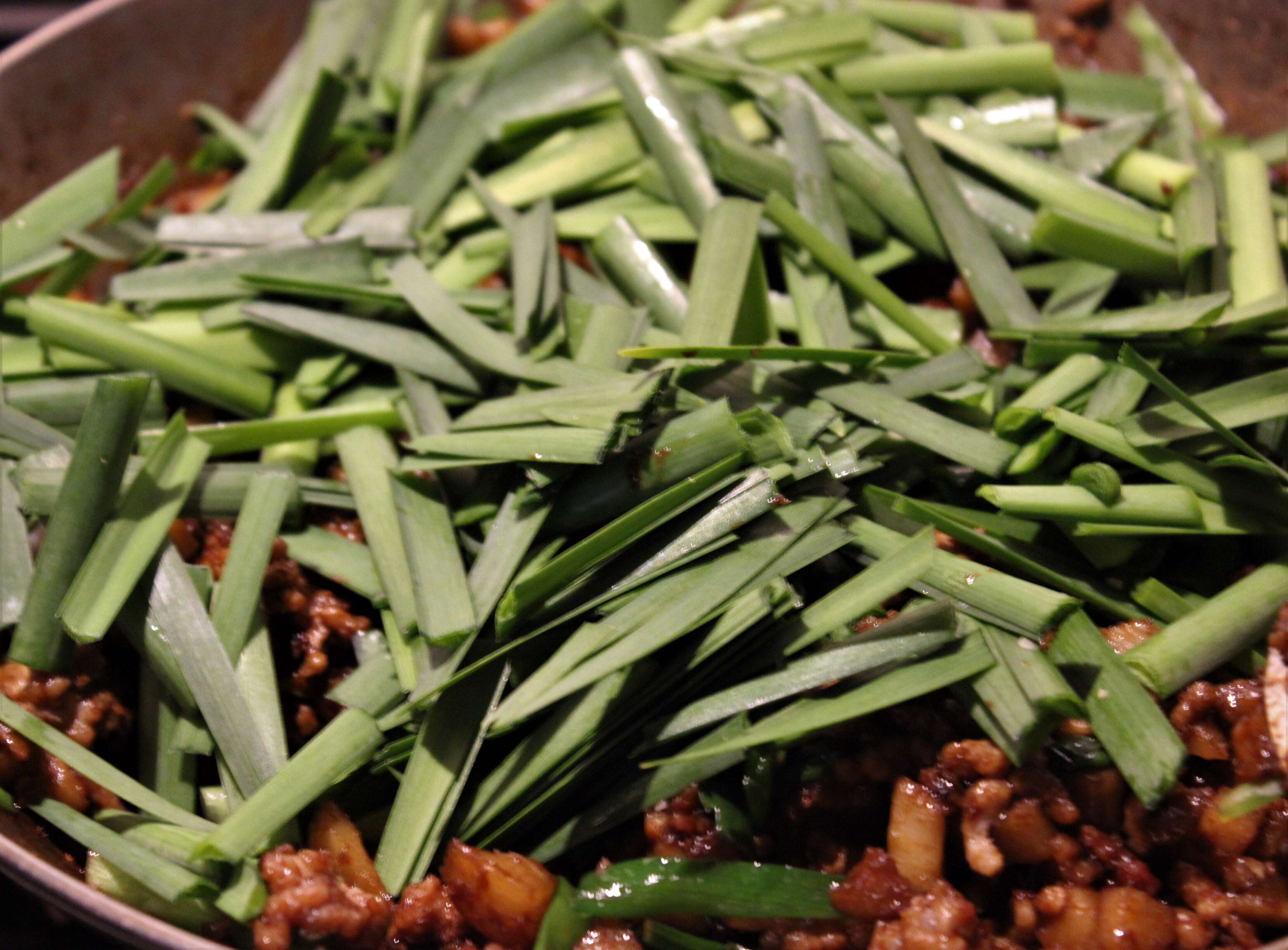 5.ニラの根元の部分がくたっとしたら、残りのニラを加えてひと混ぜし、火を止めて余熱で火を通す。