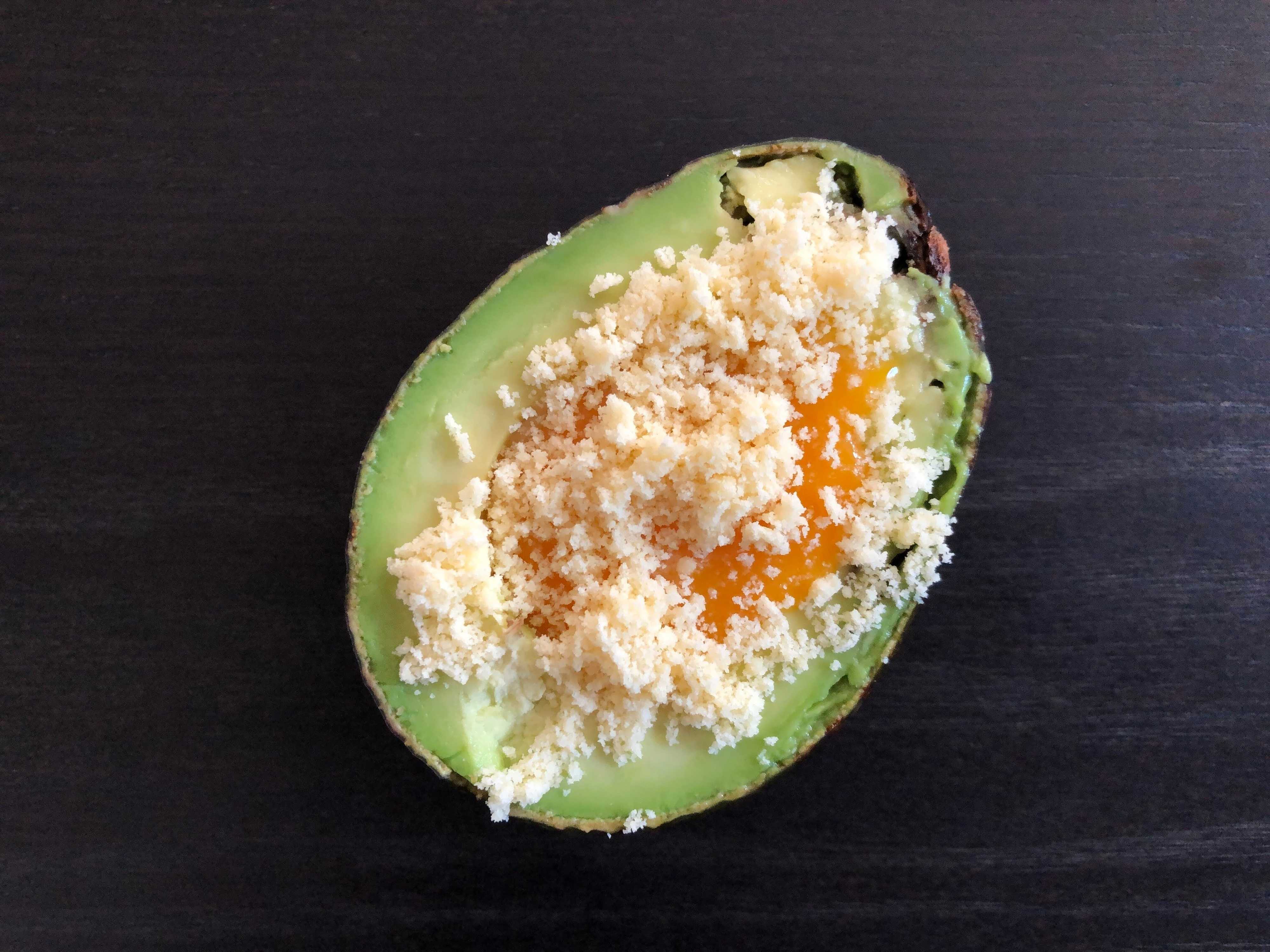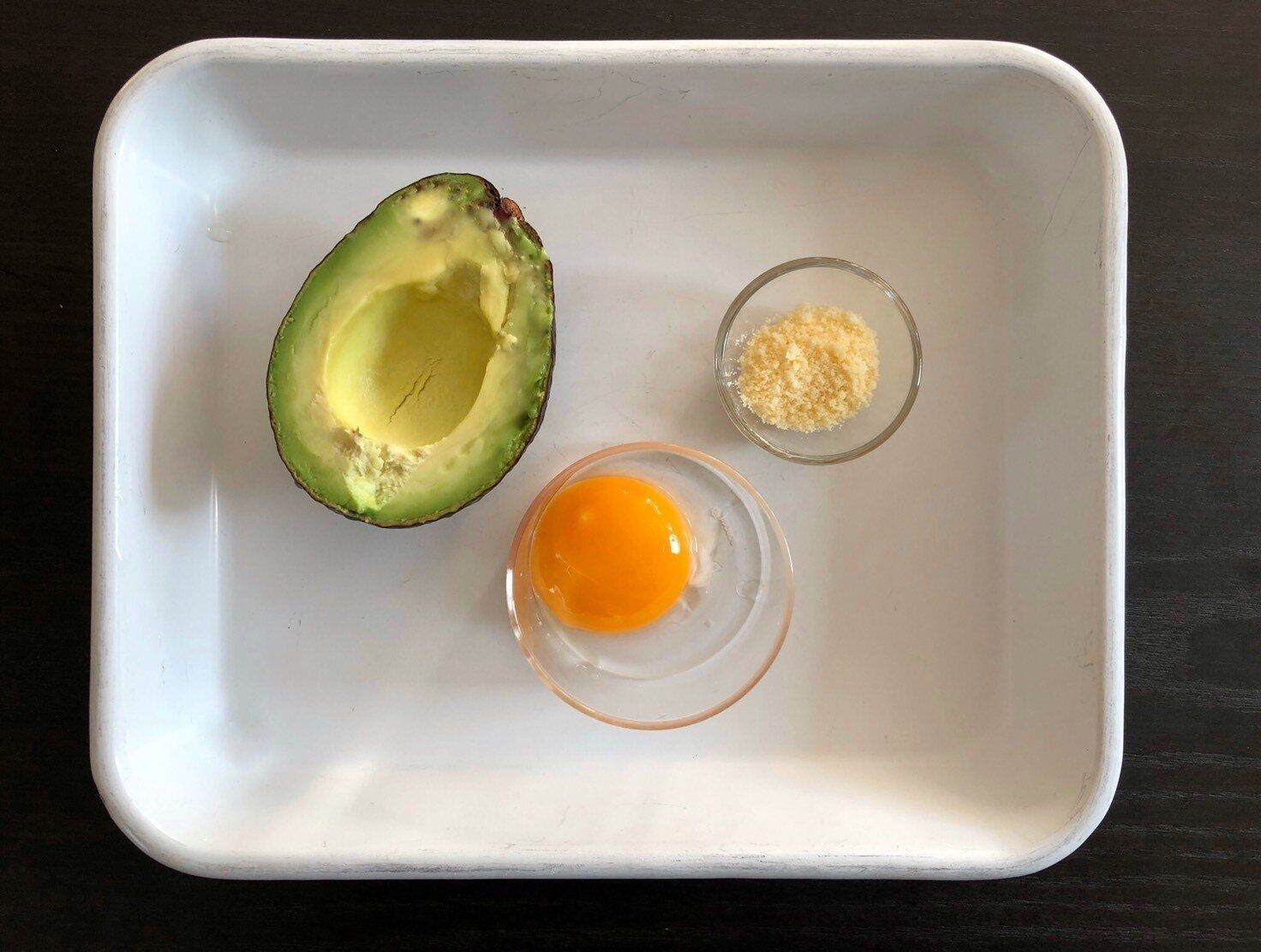(1)アボカドの種の部分の凹みに黄身を入れ、粉チーズをかける。