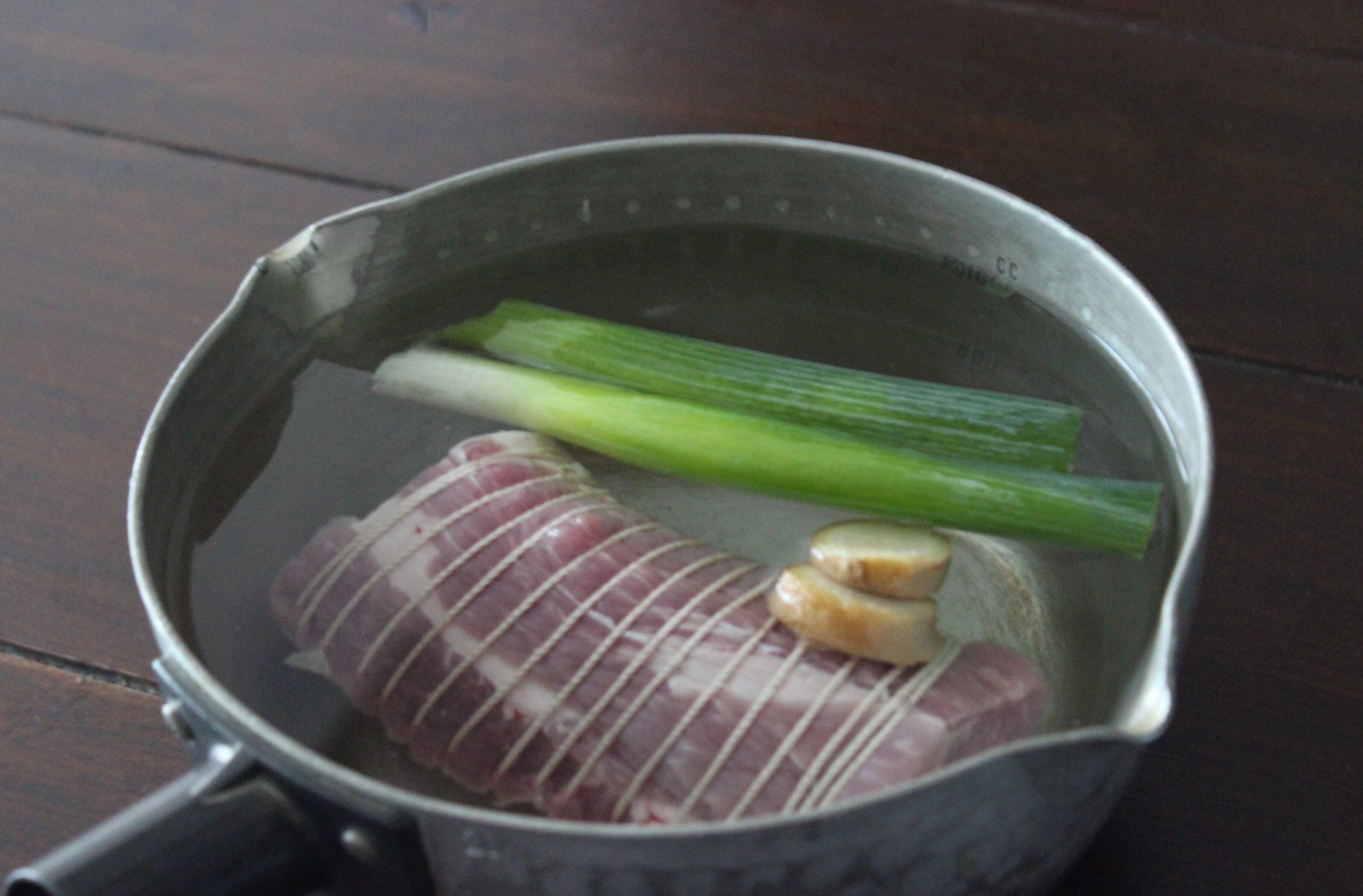 2.鍋に豚肩ロース、ねぎの青い部分、生姜を入れ、豚肉がしっかりと被る程度の水を入れて中火にかける。沸騰したら火を弱め、煮立たない程度の火加減で1時間ほどゆでる。