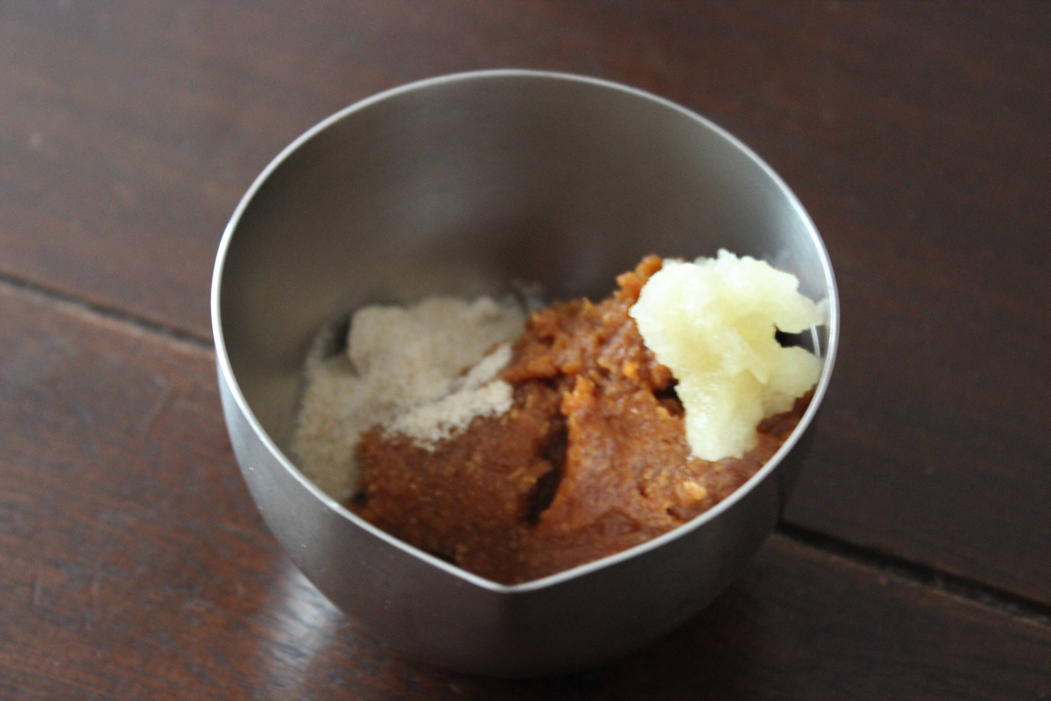 3.豚肉をゆでている間ににんにく味噌を作る。味噌、砂糖、煮切りみりん、にんにく(すりおろし)を混ぜる。
