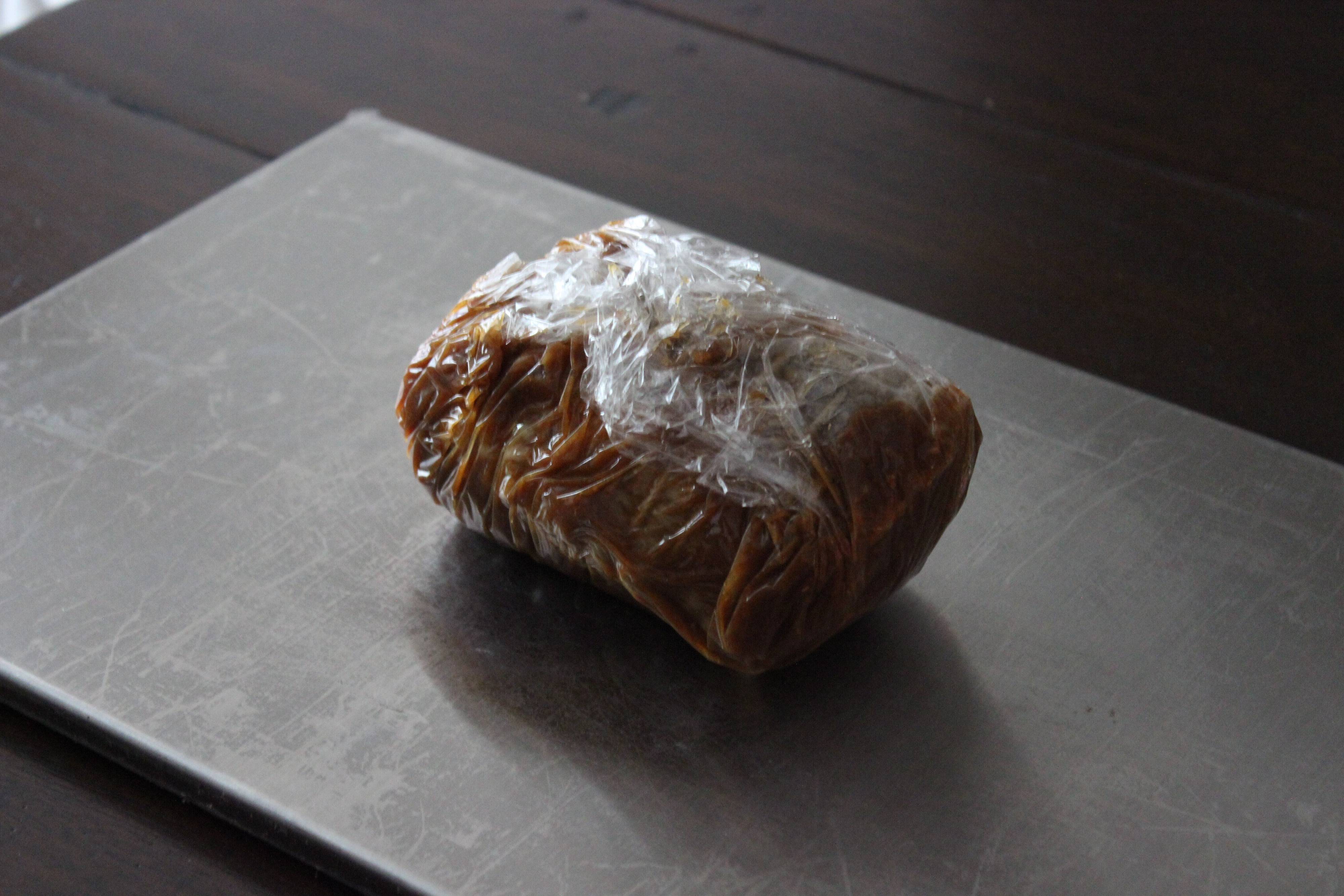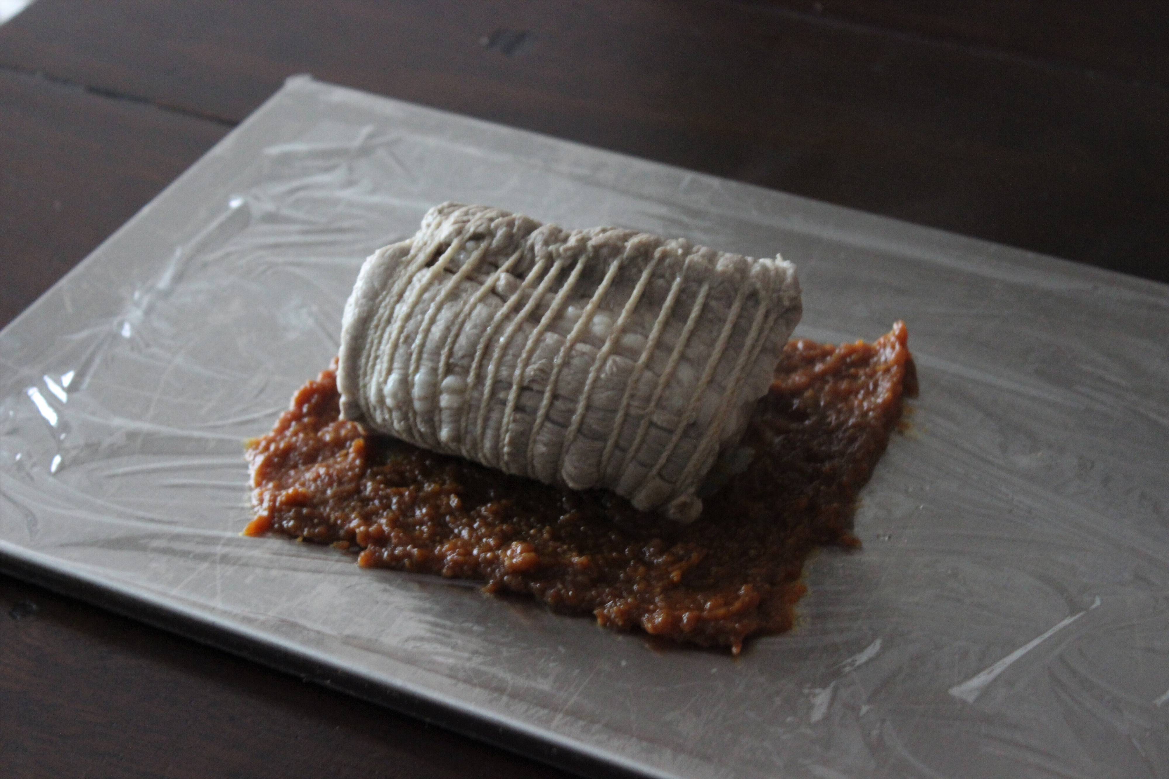 4.3をサランラップの上に広げ、ゆでた豚肉を乗せ、全体に味噌がかぶるように包んで冷蔵保存する。(写真ではタコ糸がついたままになっていますが、タコ糸を切ってから味噌で漬けたほうが食べやすいので、切ってください)