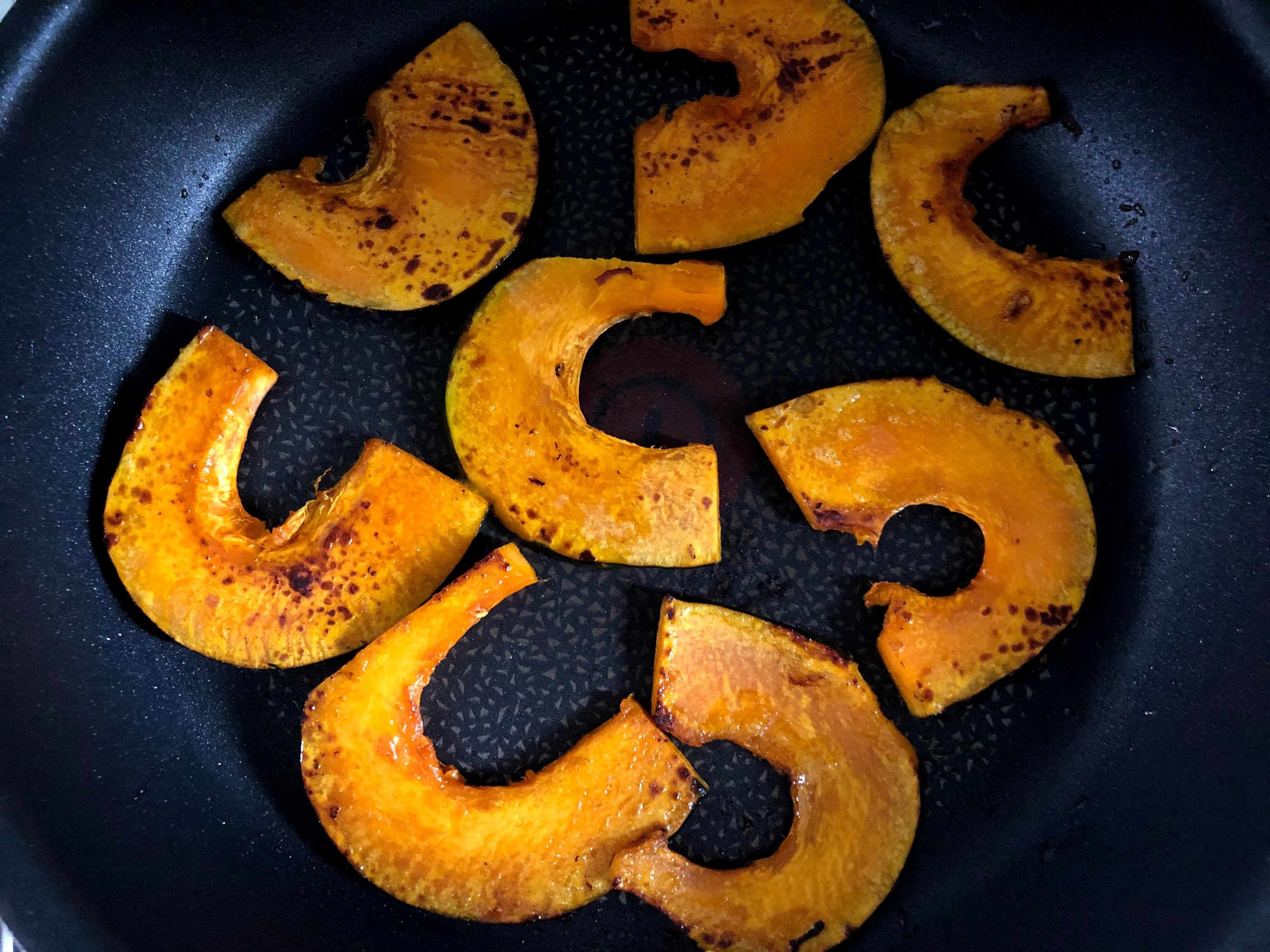 (2)かぼちゃを入れて3分程度加熱し、ひっくり返してさらに2分程度加熱して完成。