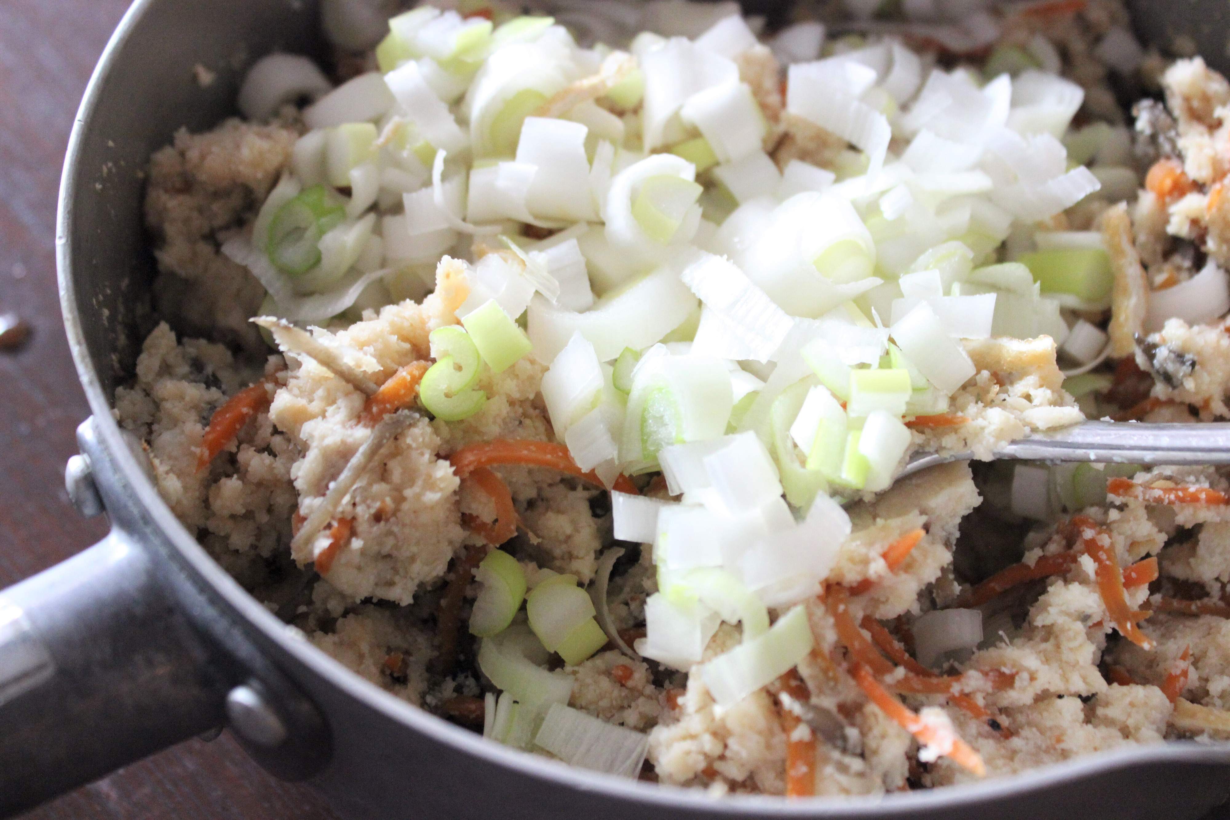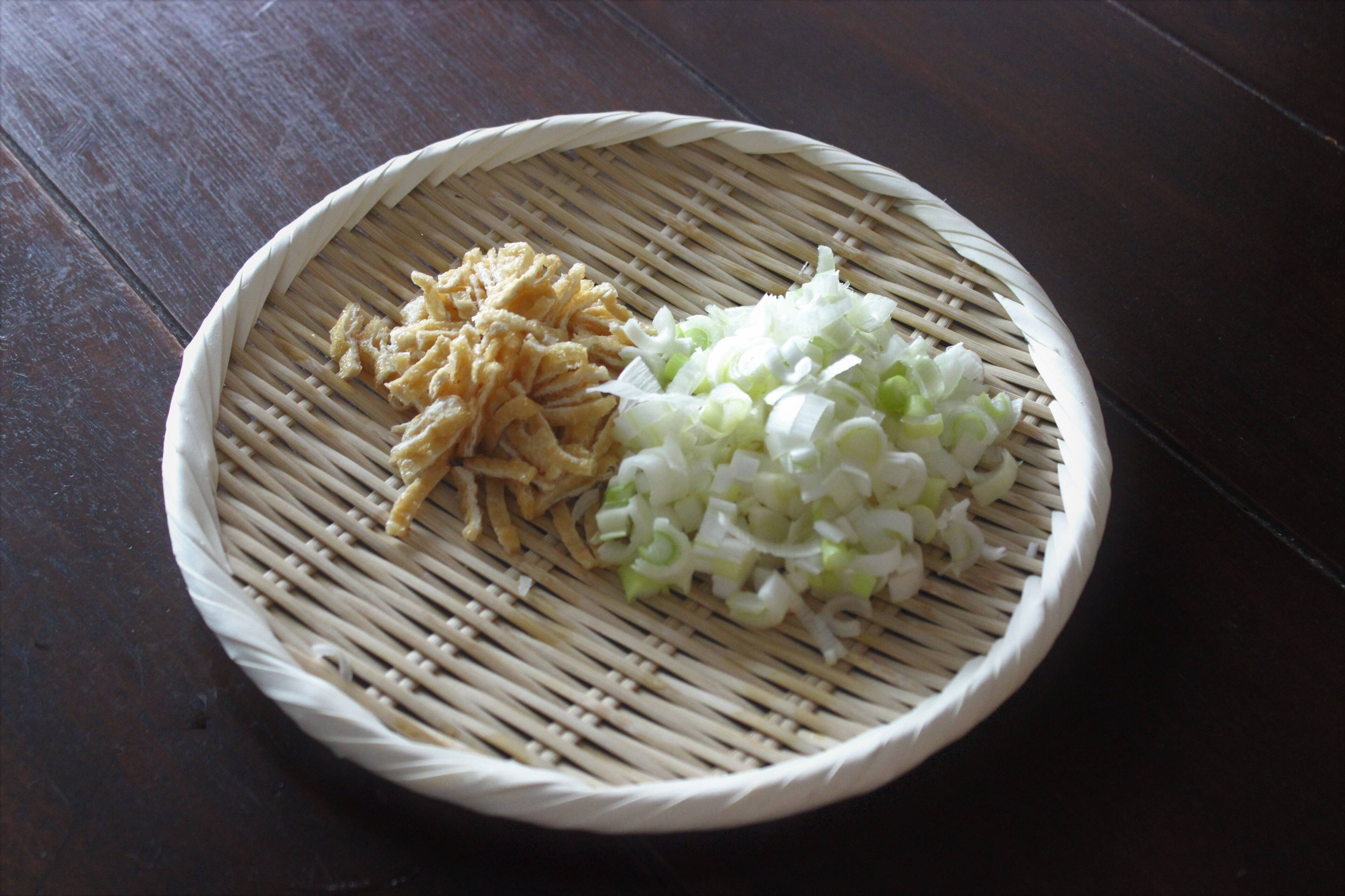 1.油揚げは縦半分に切った後千切り、長ねぎは粗く刻む。卯の花の煎りには脂分が少し多いほうがおいしく仕上がるので、油臭さがなければ油揚げは油抜き不要。