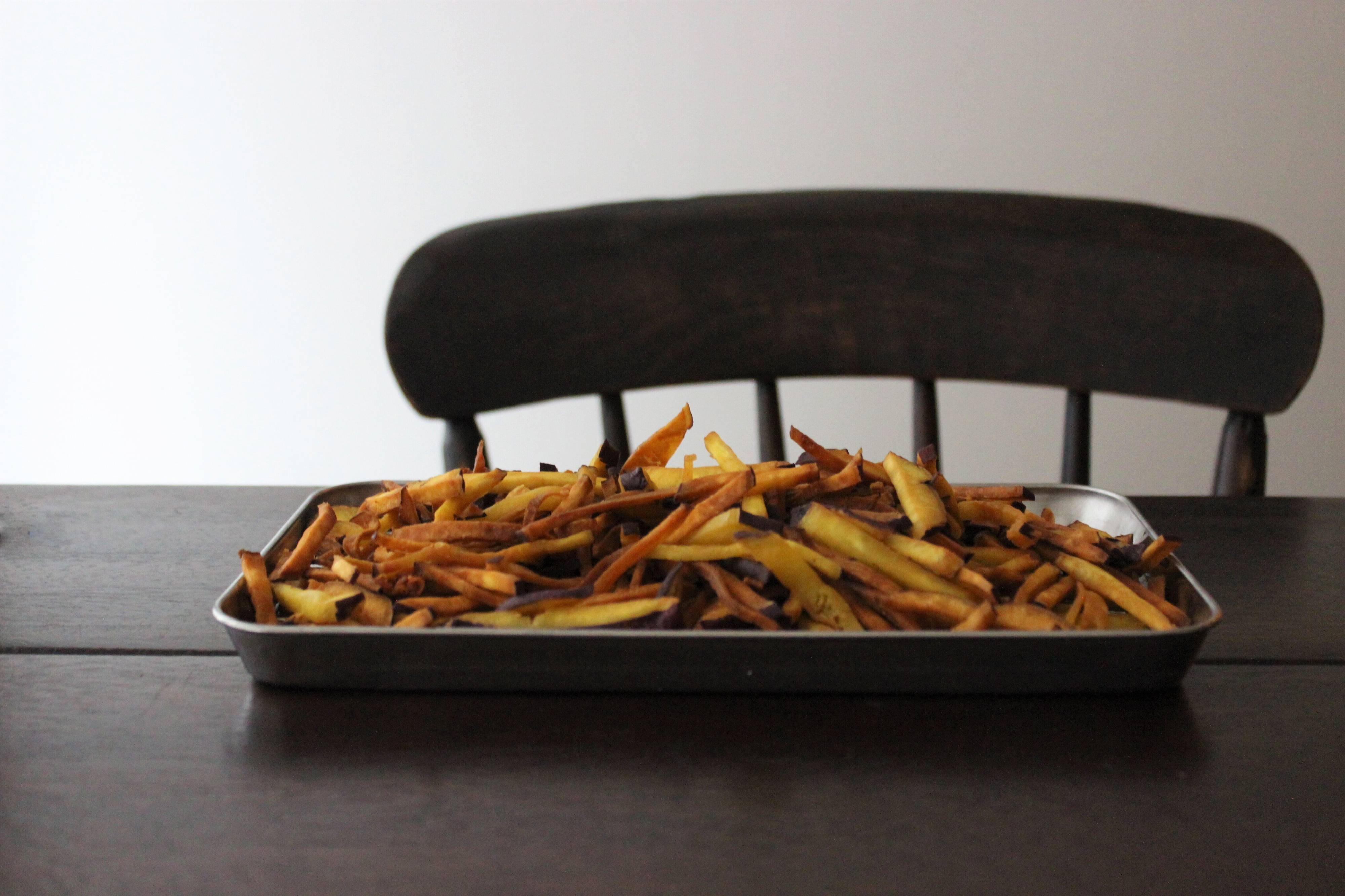ざくざくと千切りに切ってフライパンにならべ、かぶる程度の油を注いで弱めの中火にかけ、じっくり時間をかけてきつね色になるまで揚げるだけ。